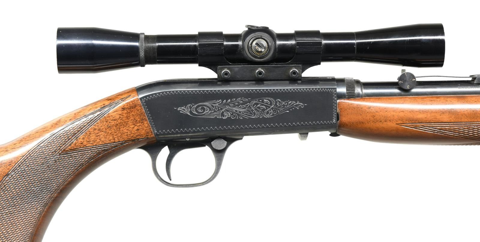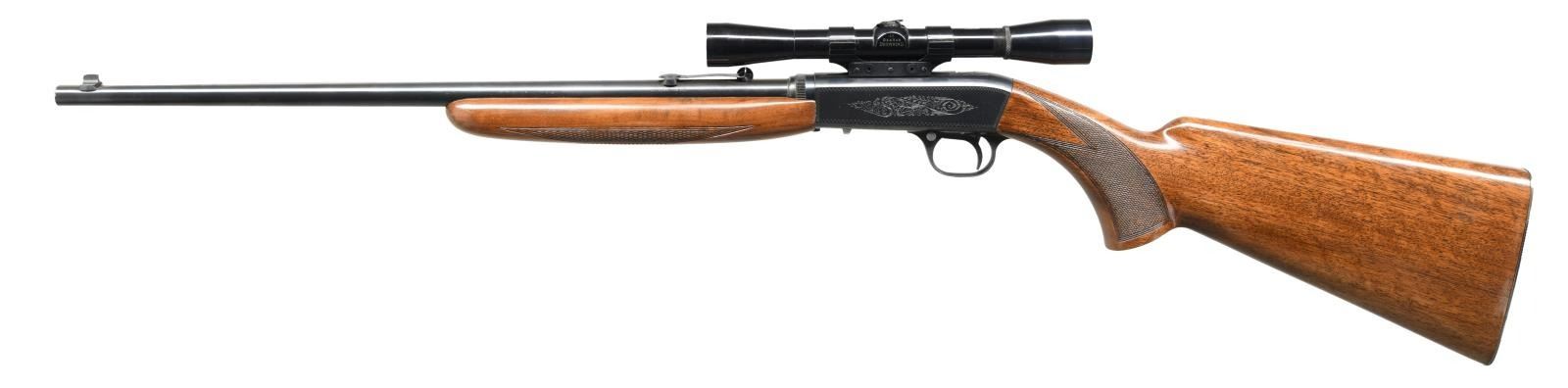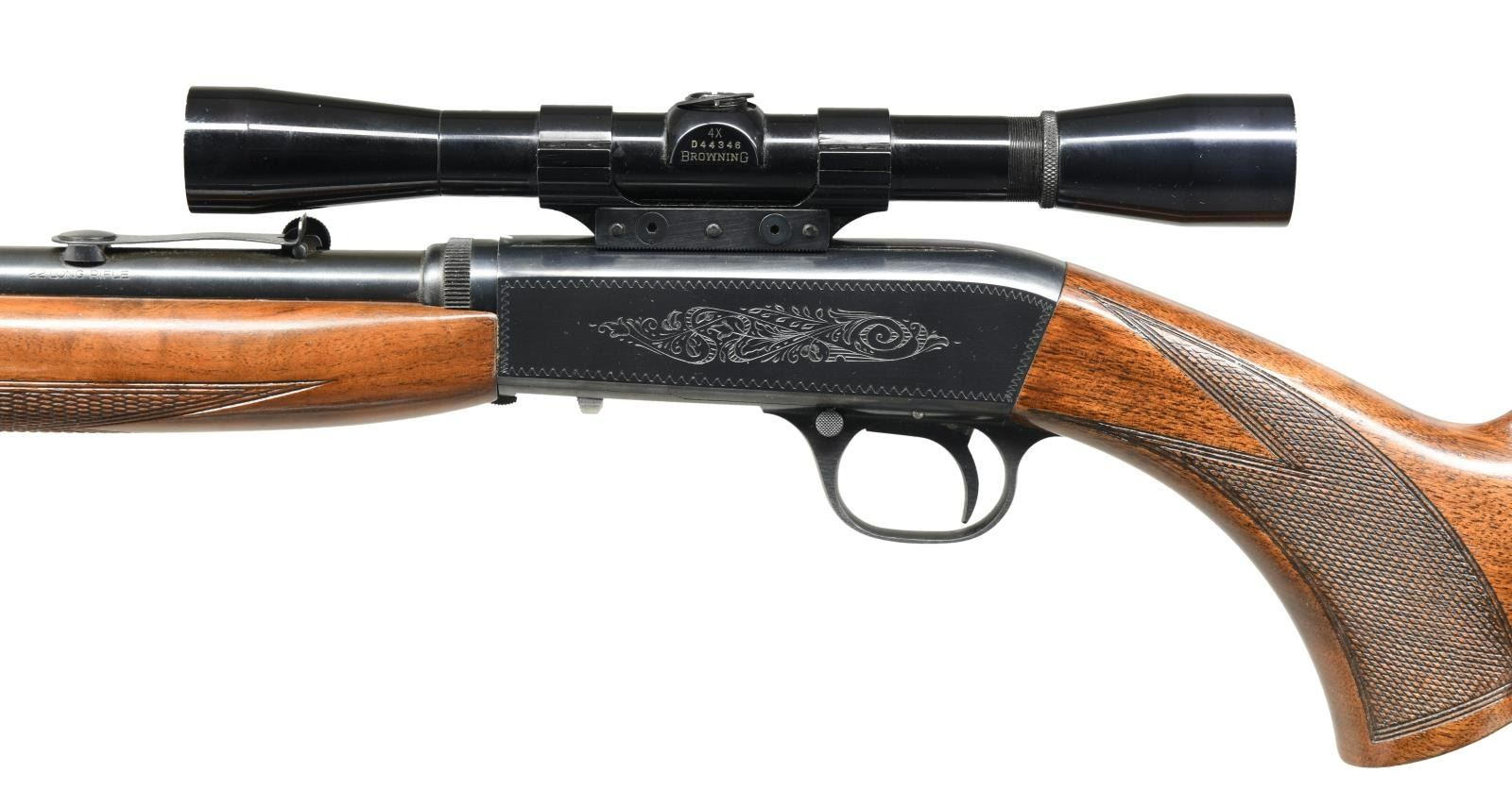 BROWNING SCOPE. Cal. 22 LR. S# T49490. Bbl. 19 3/8". SA-22 semi-automatic rifle manufactured in Belgium by FN and imported/retailed by Browning Arms Company. The barrel is marked with Browning's importer information above "MADE BELGIUM" over the top, with the caliber designation on the left. Receiver features light foliate engraving with a wavy line border on either side. Metal components exhibit a blued finish. Checkered wood buttstock with checkered wood forend. Buttstock has been sanded and revarnished at one time. Dovetailed blade front sight with dovetailed adjustable square notch rear sight. Receiver is mounted with a Browning 4x scope. CONDITION: metal components retain bountiful amounts of their original factory blue finish, exhibiting some light superficial marks from handling and storage. Mirror bore, exhibiting well defined rifling throughout. Wood furniture is very good overall. Scope retains a clear optic. PROVENANCE: The Collection of Gun Sport Ltd. owned by Jon R. Thomas. (23-3620/MLW). CURIO. $1,200-1,800.