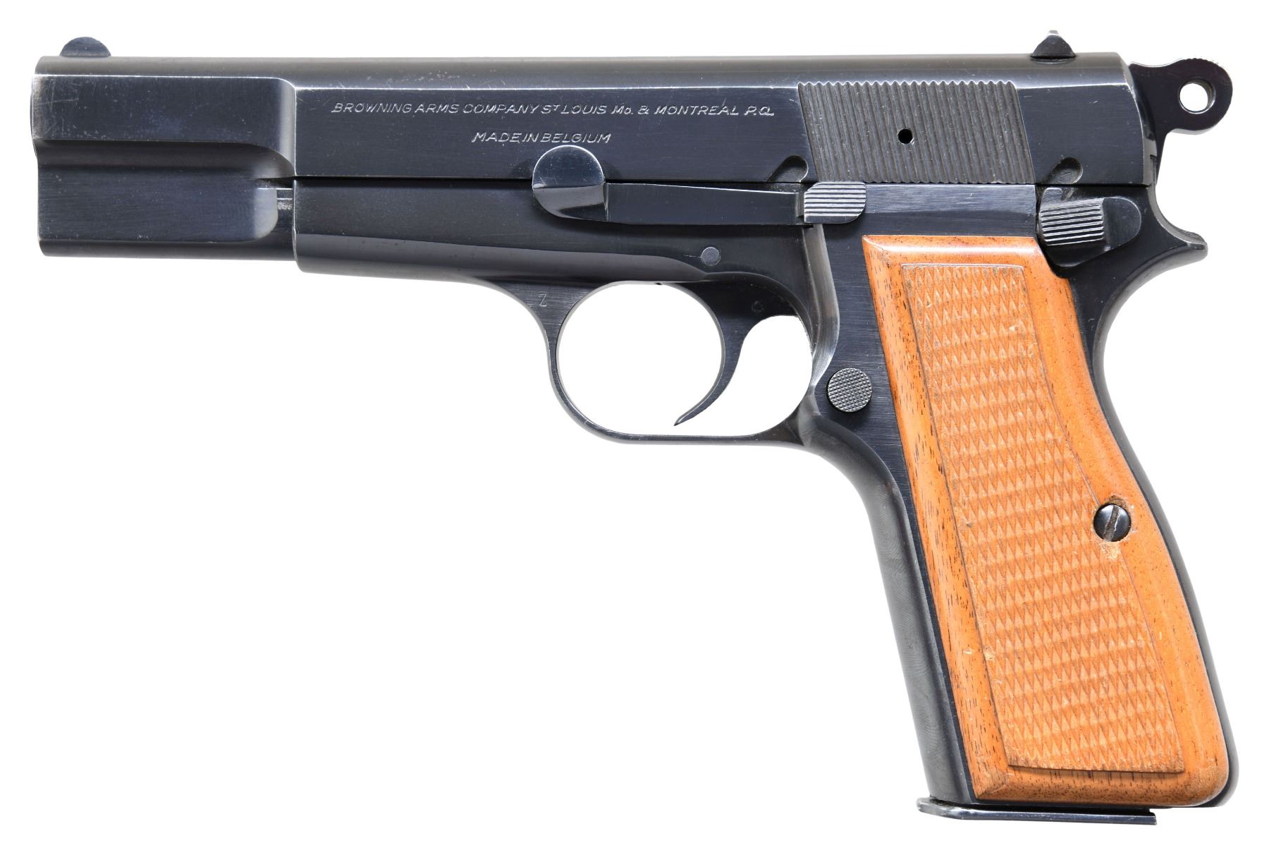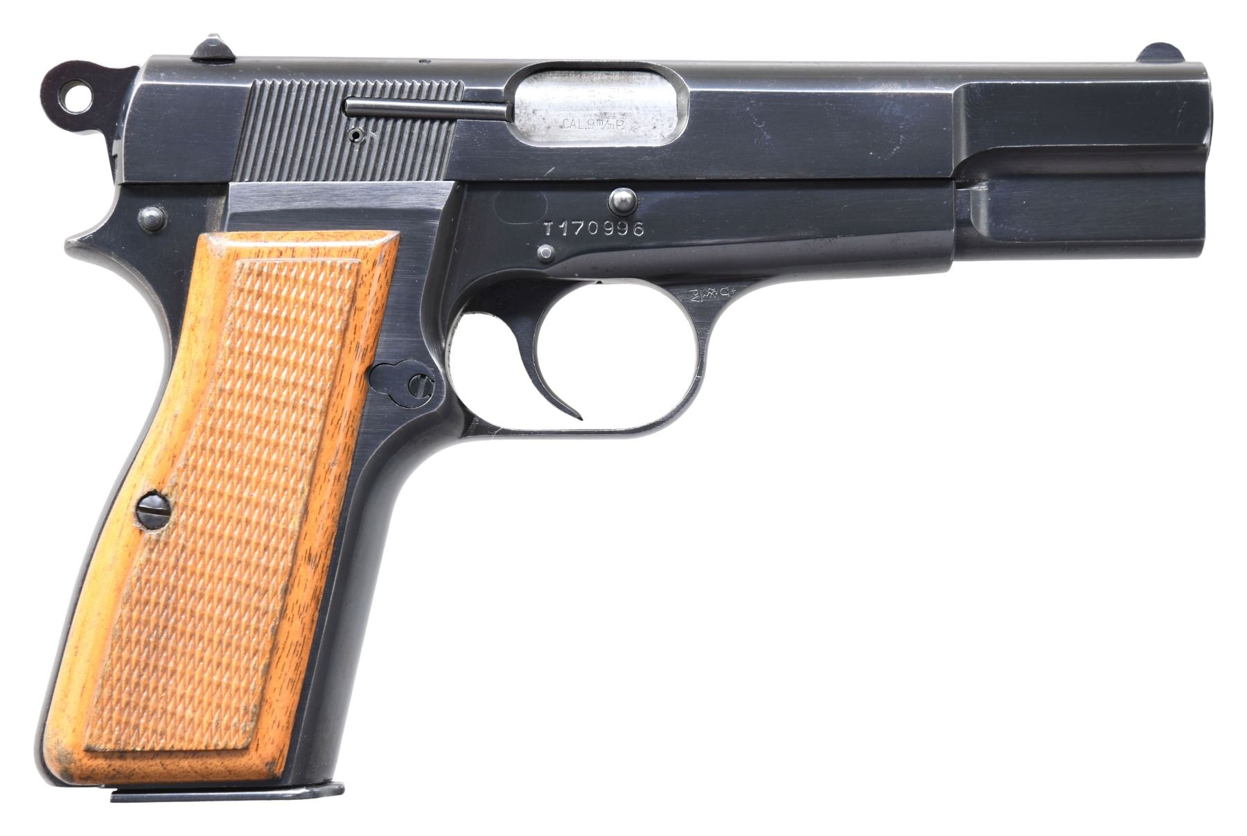 SEMI-AUTOMATIC PISTOL WITH SOFT CASE. Cal. 9mm Luger. S# T170996. Bbl. 4 5/8". High Power semi-automatic pistol mfg. in Belgium by Fabrique Nationale and imported by Browning Arms Company in 1966. The left side of the slide is marked with Browning Arms' importer information above "MADE IN BELGIUM". Right side of the forward trigger guard web and bbl. exhibit Belgian commercial proofs. Metal components exhibit a blue finish overall, save for on the bbl., which is polished in-the-white. Frame is mounted with 2-piece checkered wood grips, which feature red anti-moisture barrier paint on the interior of the panels. Fixed half-moon blade front sight, with dovetailed U-notch rear sight. MAGS: 1 13-rd. mag. marked "GP35 Cal.9MM" on the side. UNATTACHED ACCESSORIES: black leather Browning soft case. CONDITION: metal components retain the majority of their original factory blue finish, exhibiting some spots of light thinning and wear, a few superficial handling marks, some scattered areas of light to mild surface oxidation, as well as a few small concentrated spots of light to mild pitting. Mirror bore, exhibiting some spots of light pitting, while retaining well defined rifling throughout. Grips show a few minor marks and impressions from handling and storage, but otherwise remains sturdy and serviceable. Soft case shows some light wear, but otherwise remains sturdy and serviceable. PROVENANCE: the Estate Collection of Charles Wagner. (25-261/MLW). CURIO. $500-1,000.