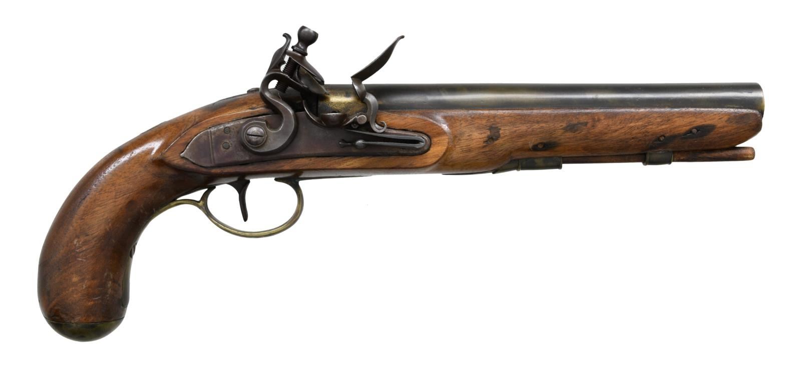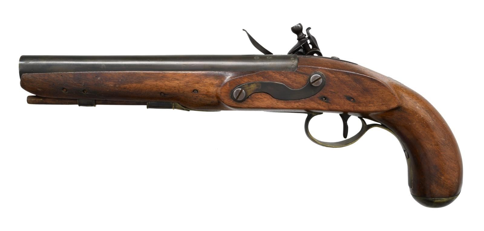 Cal. 60. NSN. Bbl. 8 1/2". Top rear of bbl. marked "LONDON" & w/ a circled Belgian "E/LG" proof. Rear of bbl. also marked w/ British style proofs & 9 star markings. Brass thimble, trigger guard & grip cap. Hardwood stock w/ ramrod. CONDITION: stock has added varnish w/ a couple small cracks, scattered flaking & handling wear. Brass parts are a dull yellow patina w/ scattered oxidation. Balance of other metal is a brown patina w/ some dings & oxidation. Oxidized bore. (01-23651/MJC). ANTIQUE. $200-300.
