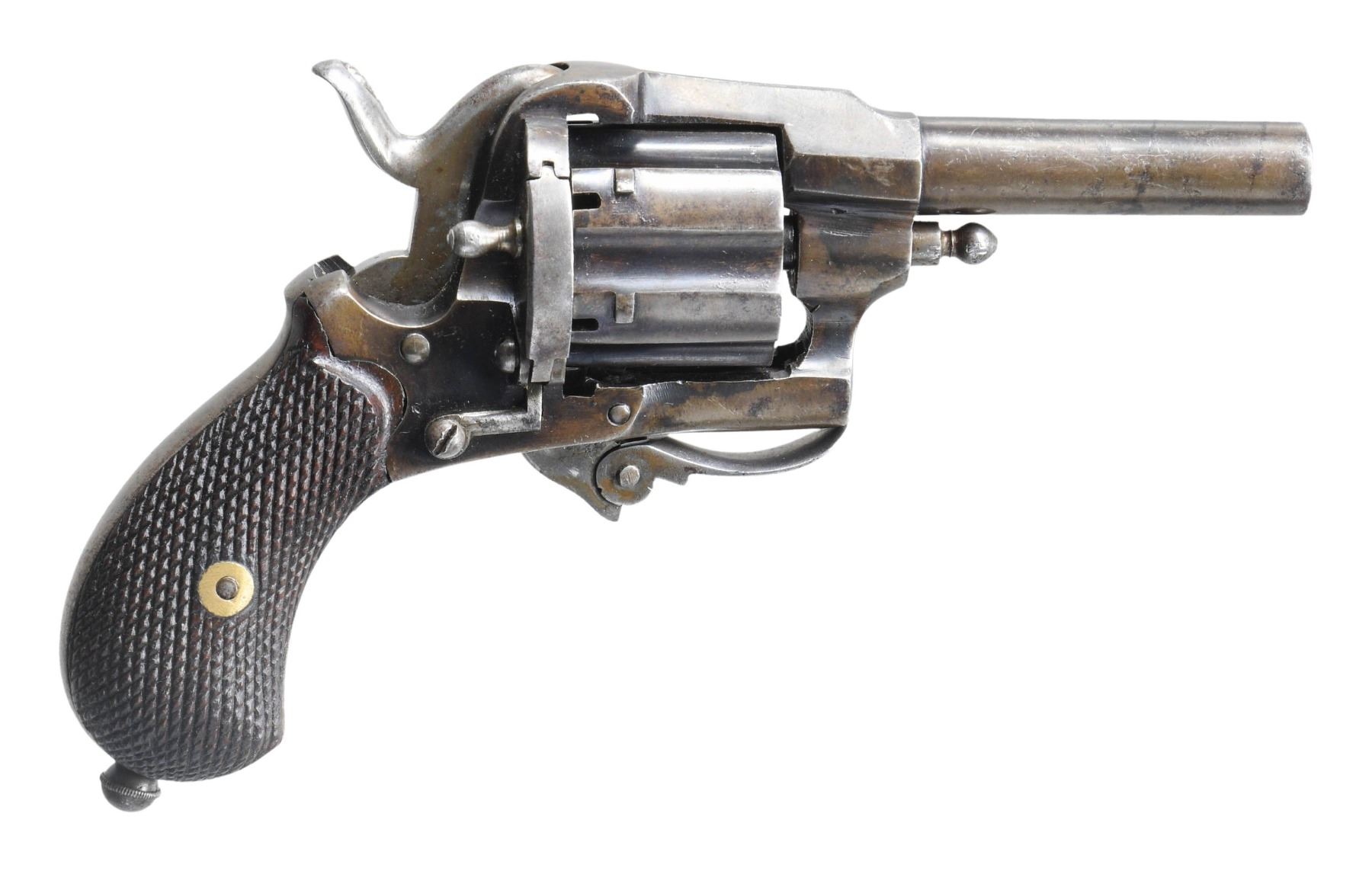 REVOLVER. Cal. 7mm Pinfire. NSN. Bbl. 2 1/2". Folding trigger double action pinfire revolver produced by an unknown mfg. in Belgium. Left side of the frame is stamped with a Crown/N proof above a Belgian "E/ LG/ *" proof. Butt is etched "XII". Metal components exhibit a blue finish. Frame is mounted with 2-piece checkered wood grips. Interior of right grip panel is stamped "HG". Butt features a threaded ball, which when removed acts as the ejector rod. CONDITION: metal components retain fair amounts of their blue finish, with the balance having faded to gray and brown patinas, exhibiting some light pitting overall. Bore exhibits scattered spots of mild pitting. Proper manual mechanics in SA and DA. Grips show some smoothing, but otherwise remain sound. PROVENANCE: Estate Collection of Nicholas Apergis. (01-27523/MLW). ANTIQUE. $300-500.