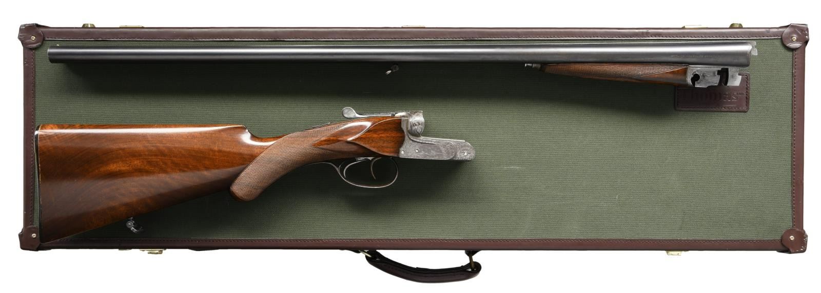 Cal. 16 GA. S# 83953. Bbl 30". Attractive Belgian side by side shotgun produced by an unknown maker. Receiver features near full coverage acanthus leaf engraving on a hatched background, with a scene of 2 pheasant on the left and right sides. Top of barrel is marked "MUNDUS STAHL" in gold on the knurled rib, with "AMTLICH PAUCHLOS ERPROBT" on the side of each barrel. Barrel tang bears the Geco logo, with Belgian proofs present on the flats, as well as on the receiver's water table. Checkered wood round knob buttstock with checkered wood splinter pattern forend. LOP: 14 1/2". Matching numbers are present on the receiver, barrels, and forend iron. UNATTACHED ACCESSORIES: contemporary green canvas wrapped case. CONDITION: barrels retain the majority of their original factory blue finish, exhibiting superficial handling marks and some scattered spots of light surface oxidation. Mirror bores, with some light marks on the interior of the left bore towards the muzzle. Receiver shows a few areas of mild discoloration, but is otherwise fine. Wood furniture shows a few scattered marks from handling and storage, but is otherwise very good. (23-2133/MLW). CURIO. $600-1,000.
