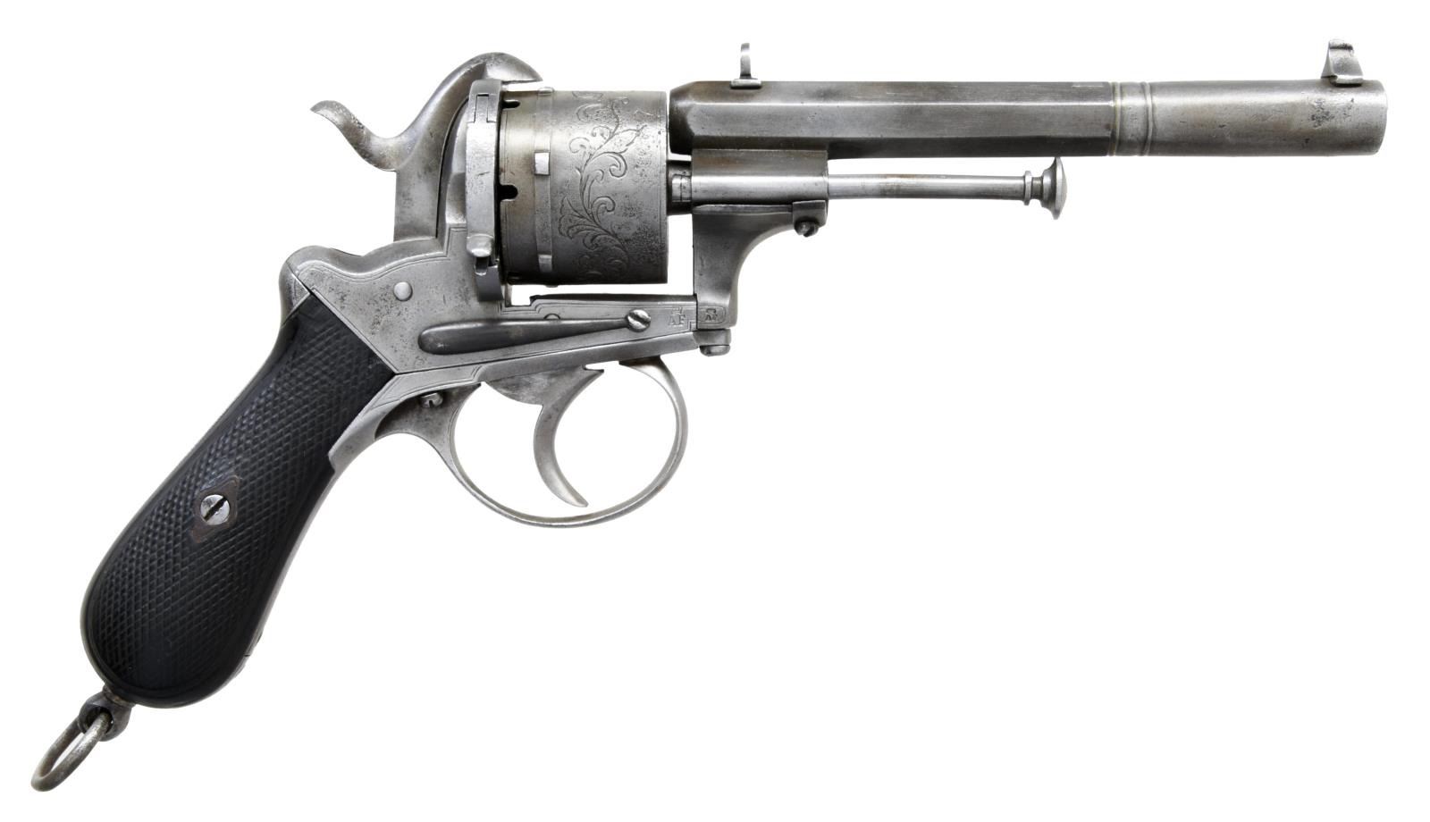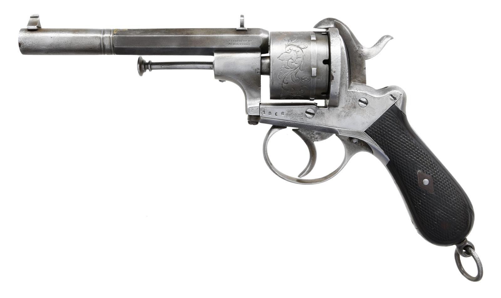 Cal. 10mm. S# 1806. Bbl 5 1/4". Metal components are in-the-white, w/ the frame being mounted w/ 2 piece checkered wood grips. Inverted "V" front sight w/ U-notch rear sight. Barrel appears to have been extended during the period, with the previous dovetail slot for the front sight having been filled in, closely followed by a band and terminating in a 2" round section of barrel at the muzzle. Barrel is marked "BONNERAVE & CHAPON. BEUNOS" (remainder of text is illegible) on the top flat, with "LEFAUCHEUX B/ ACIER FONDU" on the left flat. Belgian "(Crown)/ AF" proofs on frame with additional Belgian proofs on cylinder. CONDITION: metal components retain a mostly bare metal patina w/ some areas of darker mottled gray patina and areas of scattered pitting. Dark bore. Grips show smoothing and some scattered handling marks, but are otherwise sturdy and serviceable. (01-23624/MLW). ANTIQUE. $300-500.
