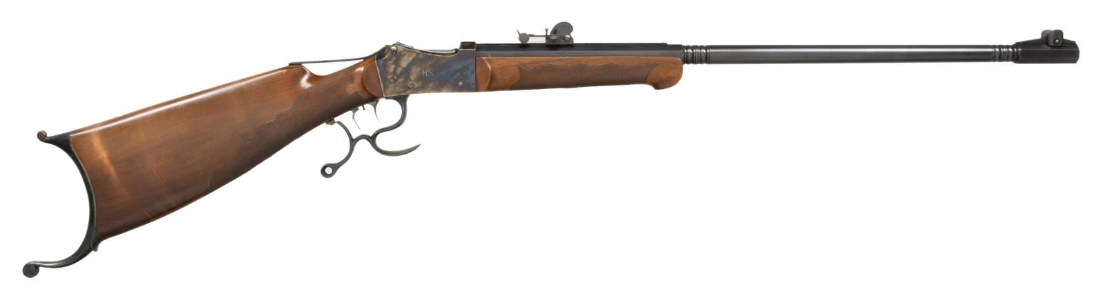 ORIGINAL CONDITION. Cal. 22 LR. S# 726 (on face of action and bottom of barrel seen with forend removed). The 27 3/4" octagon to round to octagon barrel which transitions through multi turned rings has rear top flat shaped to accept elevation adjustable rear barrel sight. A distance scale is engraved on top flat. Left flat is engraved "MARTINY SAUVEUR CHAMPIONNE DU MONDE". Maker's monogram "HS" is in front of top dovetail. These letters are also silver inlaid on sides of case hardened Martini type action. Action is fitted with double set triggers and has scrolled opening lever with checkered palm pad. There is a provision at back of action for aperture rear sight (not present). Buttstock of lightly figured European walnut has case hardened hook butt and sweeping right hand cheekpiece. Checkering is of fancy pattern. Matching schnabled forend screws to barrel. CONDITION: exceptionally fine. Metal with over 90% original finishes with some small specks of cleaned rust on breech bloc. Stocks have only a few minor handling marks. Bore is bright and shiny. Mechanically good. PROVENANCE STATEMENT: From the Harold Prucha Collection. (01-23275/MGM). ANTIQUE. $1,800-2,500.