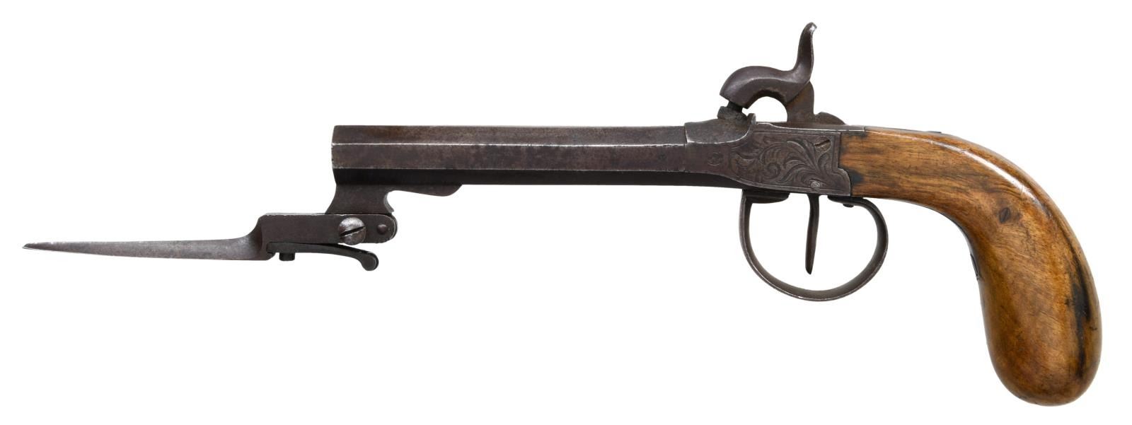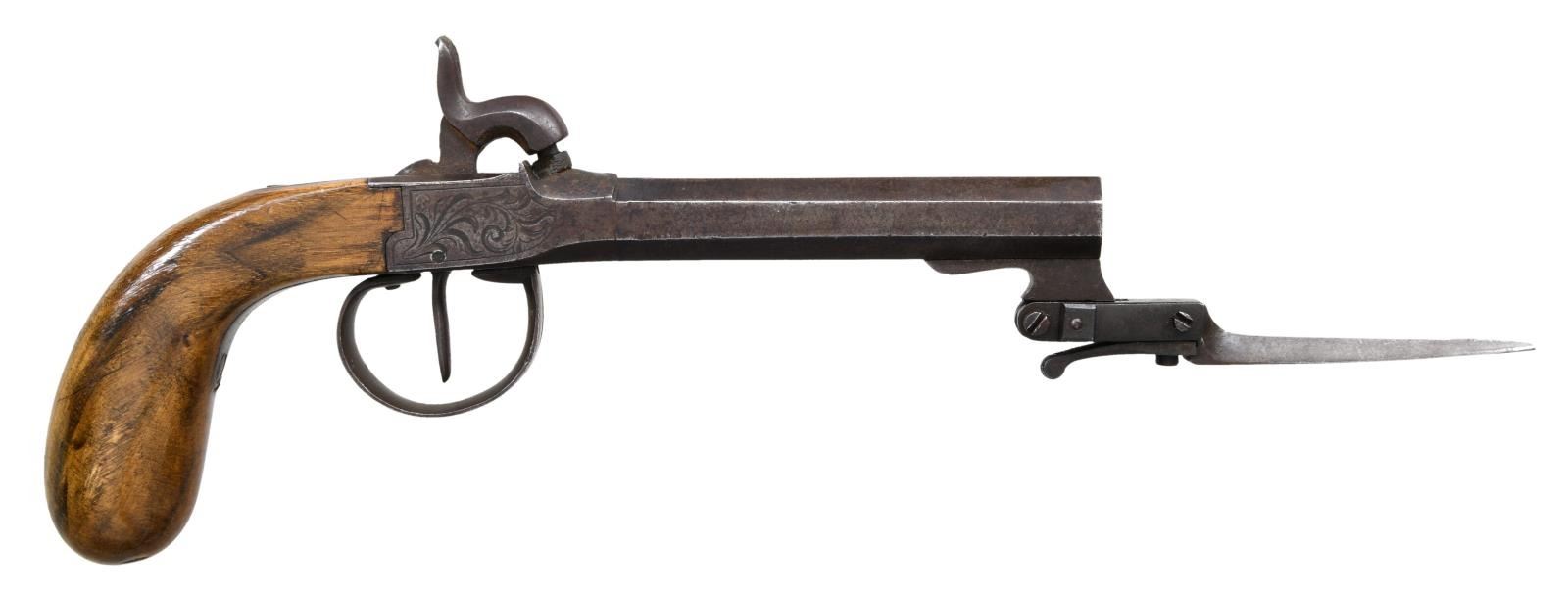 Cal. .48 Smoothbore. S# NSN. Bbl 4". Belgian proof on left side of frame. Small engraved scroll panels on either side of frame. Smooth wood grip. Under folding bayonet. CONDITION: Metal components retain a dark mottled gray patina overall. Grip shows some scattered handling marks, but is otherwise sturdy and serviceable. (01-23596/MLW). ANTIQUE. $300-500.