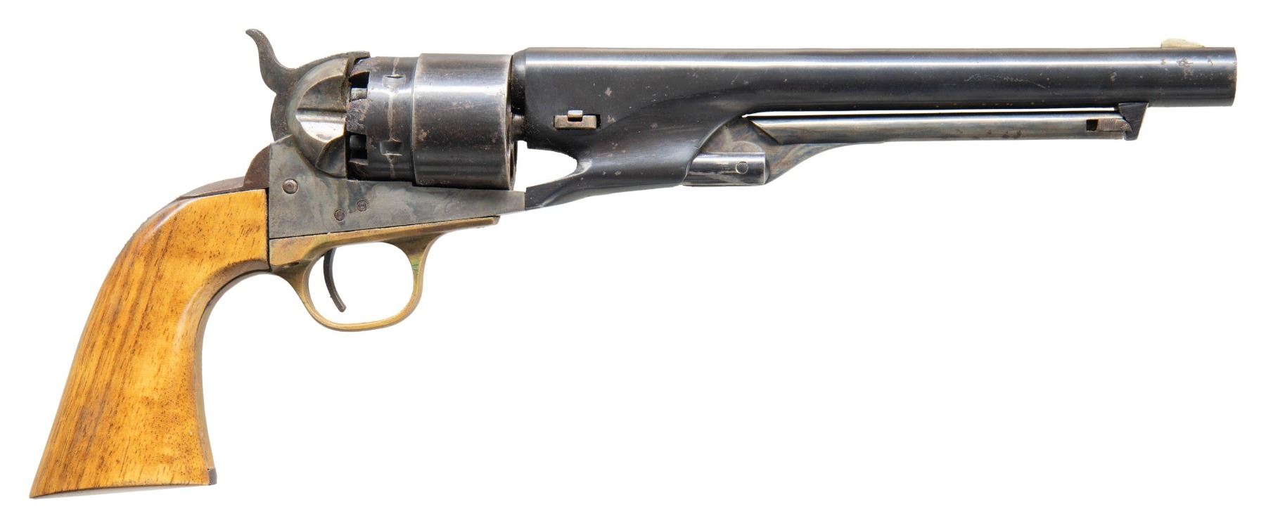 Cal. 44. S# 540. Bbl. 8". Blade front sight. Repro Belgian 1860 revolver marked "1960 NEW MODEL ARMY" on bbl. & with varied Belgian proofs. Case colored frame, hammer & loading lever. Brass trigger guard & front strap. Other parts are blued. Smooth walnut grips. CONDITION: grips show some finish wear & handling marks. Brass parts are a dull yellow with oxidation & tarnishing. Case colored parts are fading to gray with oxidation. Blued parts retain 70% finish with a heavy drag line on cyl, some fading to gray, oxidation & a few spots of pitting. Action is functional when hand cycled. Bore shows scattered oxidation but strong rifling. (01-27990/MJC). ANTIQUE. $200-300.