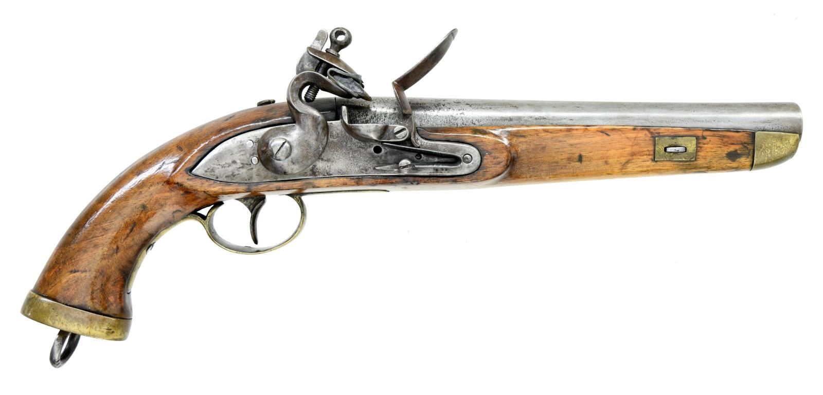 Cal. 69. NSN. Mfg. in Liege w/ 8.5" smoothbore bbl. having partial Liege star proof. Lock appears to have woven "DM" stamp. Wedge fastened walnut stock w/ lanyard ring at butt & brass accents. CONDITION: metal has cleaned appearance showing prior pitting (heaviest at touch hole) & patina. Sanded & refinished stock has gloss varnish applied w/ marks & sm. cracks. Brass escutcheons, nosecap & portions of triggerguard show cleaning w/ balance of brass dark patina appearance w/ dents. Fair bore w/ large areas of very deep pitting. Lock appears to function when cycled by hand. (01-23458/MD). ANTIQUE. $500-700.