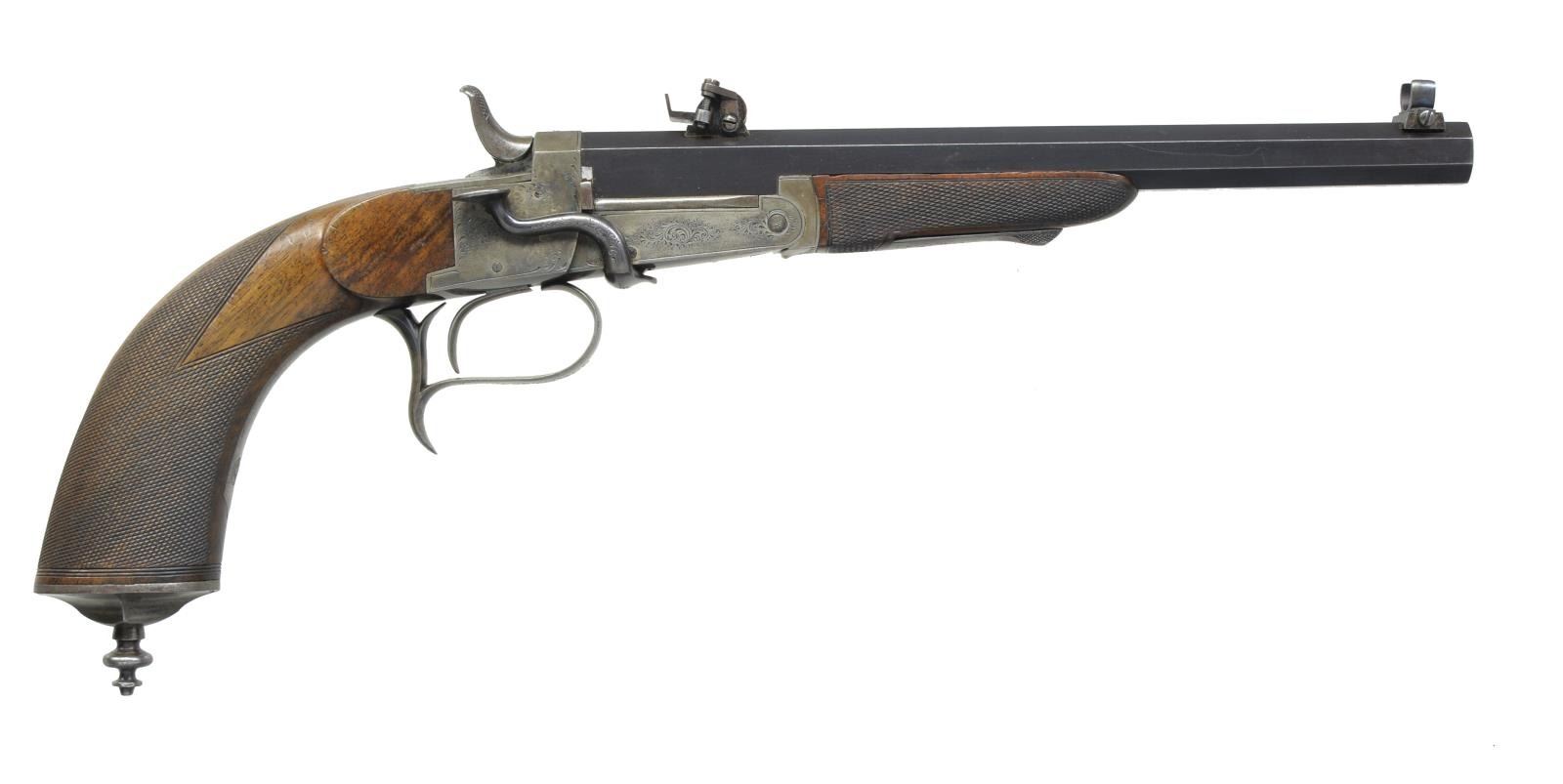 Cal. 320 Rev. S# 3853. Bbl. 9 5/8" oct. w/ dovetailed target sights; open toped windage adj. blade front sight & finely adj. elevation rear. Left side of bbl. w/ 320 & proofs of crown R, star over T & oval crown liege proof. Checkered bag handle style grip & diminutive forend. Right side thumb actuated opening lever w/ oval checkered panel. High checkered hammer spur noticeably off center to right. Silver plated grip cap w/ decorative finial. Fine scroll engraving throughout silver plated action. Blued bbl. & opening lever. CONDITION: good plus overall appearance w/ light handling marks throughout. Slight thinning at high points. Dull appearance of plating. Good plus bore w/ 1 noticeable pit about midpoint at 5 o'clock position. Tight, fine mechanical functioning. (20-1689/NW). CURIO. $400-600.