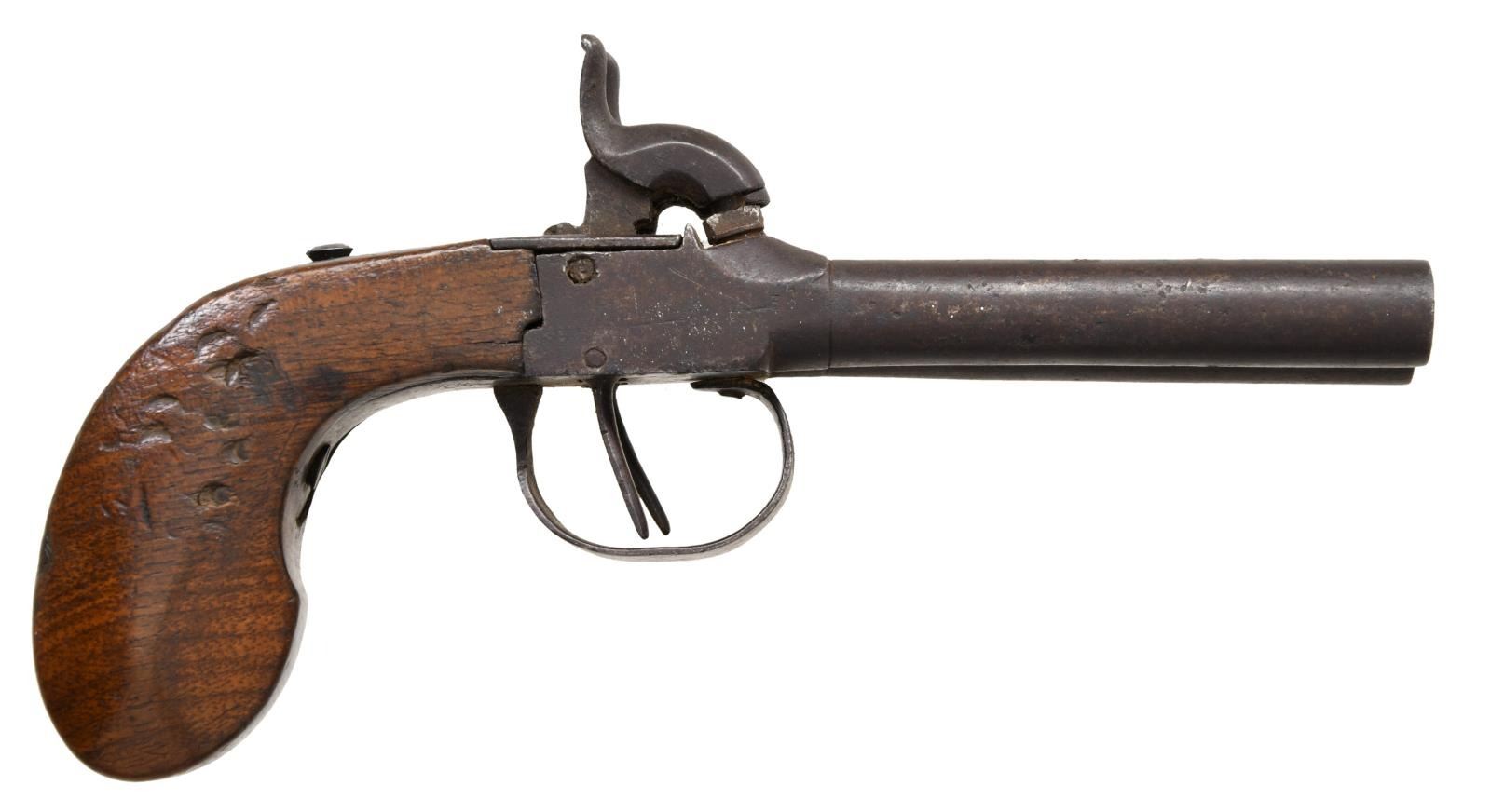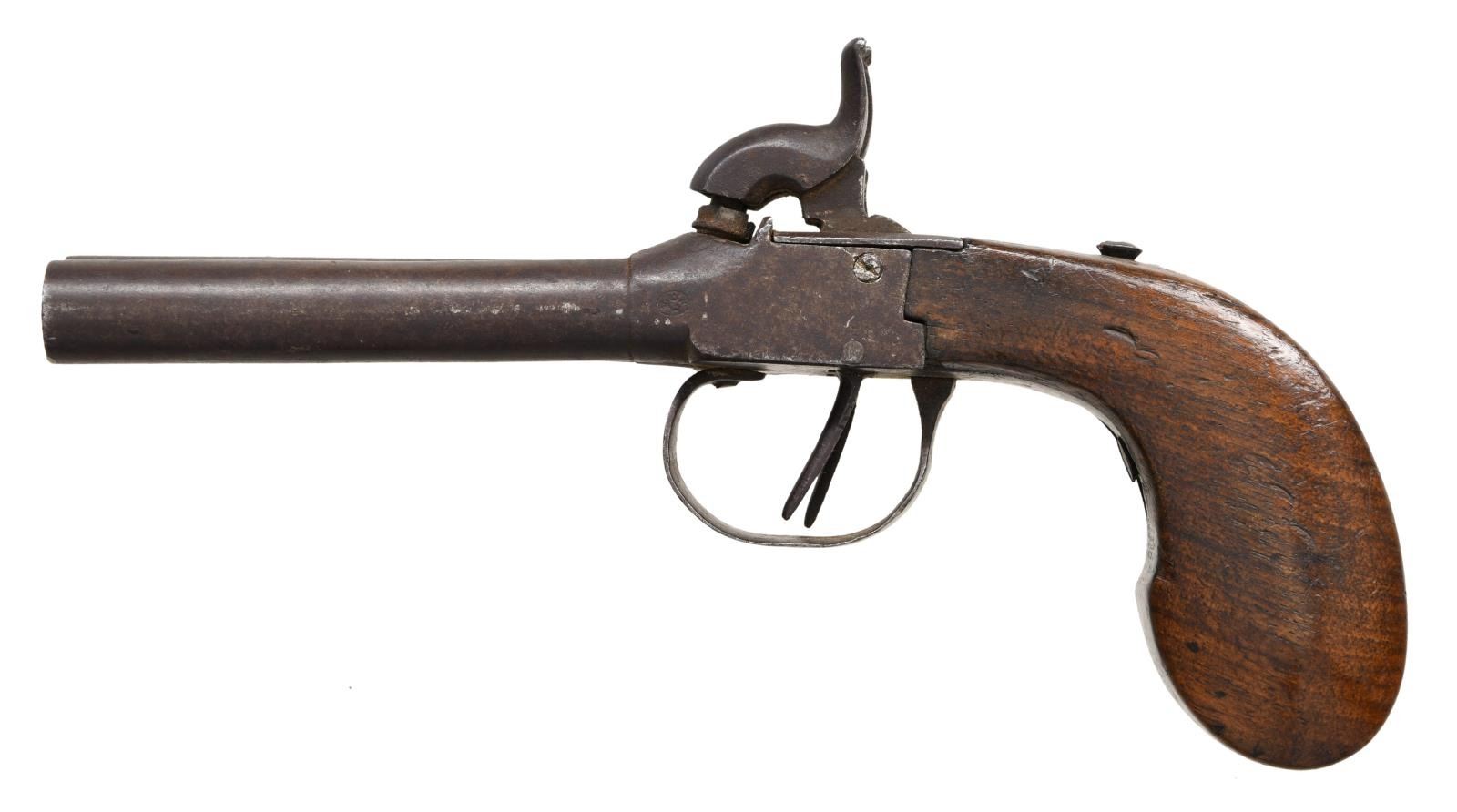 Cal. .44. S# NSN. Bbl 3 1/4". Belgian definitive proof on left side of frame. Double bbl w/ smooth wood grip. CONDITION: metal componetns retain a dark mottled gray patina overall w/ scattered spots of pitting. Grip shows marks and impressions from storage and handling and a minor crack on each side. PROVENANCE: From the estate collection of Thomas J. Mulligan. (01-23374/MLW). ANTIQUE. $100-300.