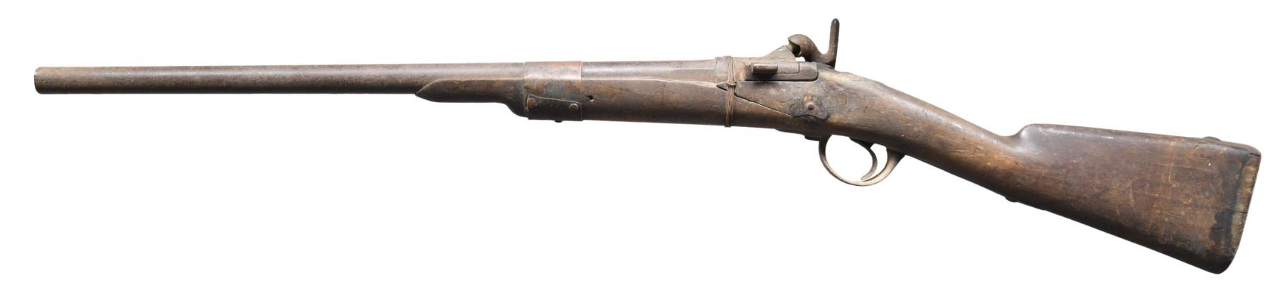 Cal. 12ga. NSN. French military musket converted in Belgium to a sporting breechloading shotgun. Bbl. 25" w/out sights. Tabatiere breech system using French back action hammer lock. Converted musket stock w/ brass band. CONDITION: poor. Pitted oxidized metal. Wood is heavily worn with large breaks, missing pieces & wire holding barrel to stock. Pitted bore. Lock appears functional, breech system missing spring. (01-26259/MD). ANTIQUE. $100-200.