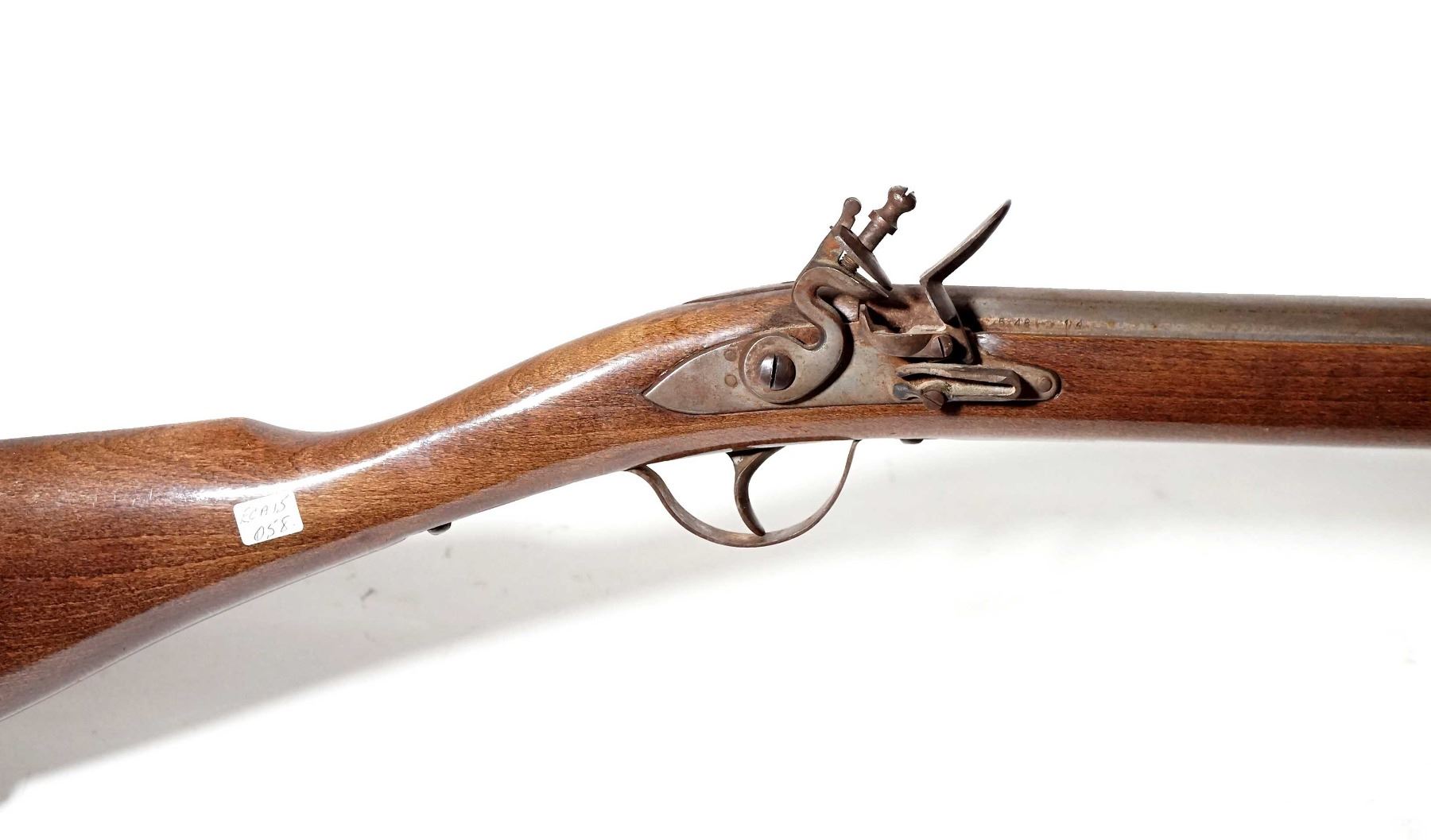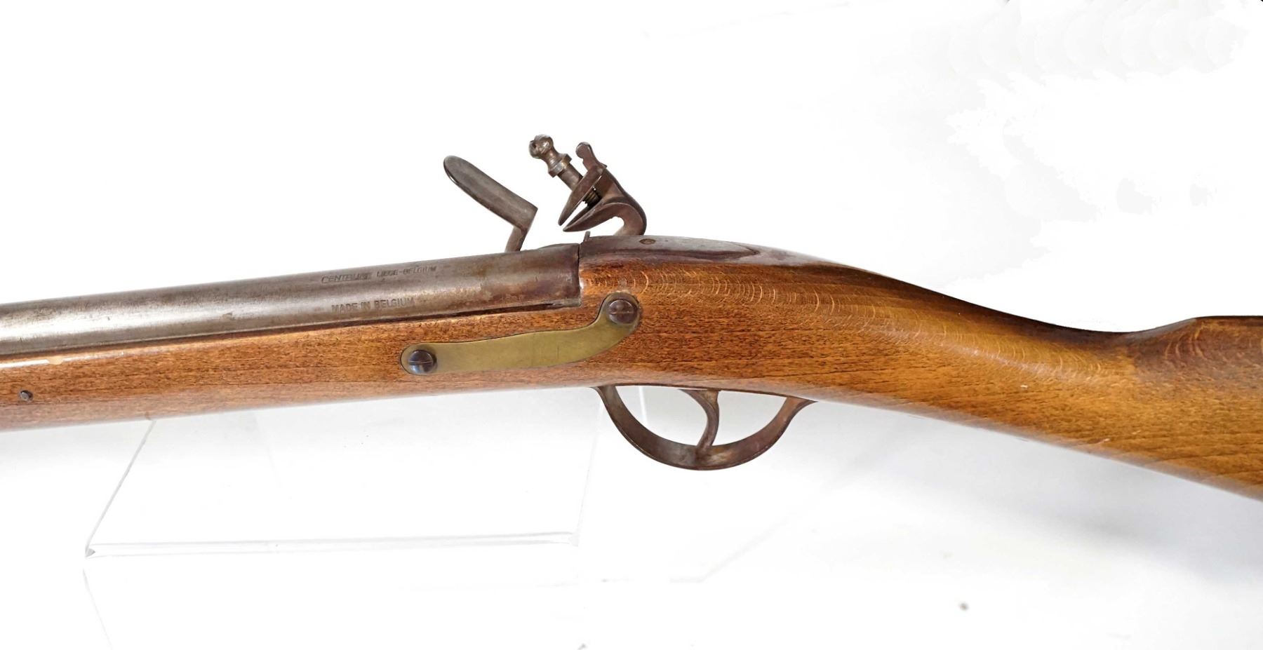 Fully working, 65 inch 3 strap black powder flint lock. Barrel is marked "Made in Belgium" in English, numbered 168 on left side of the barrel and 54814 on the right. Light wear marks on the stock, could use a little TLC.