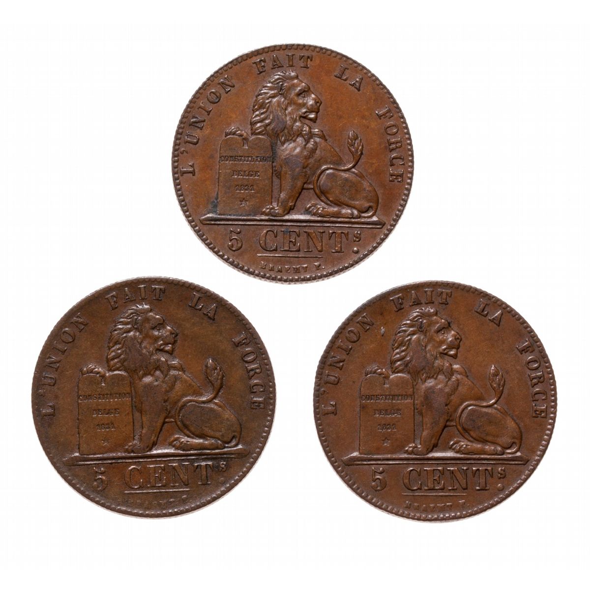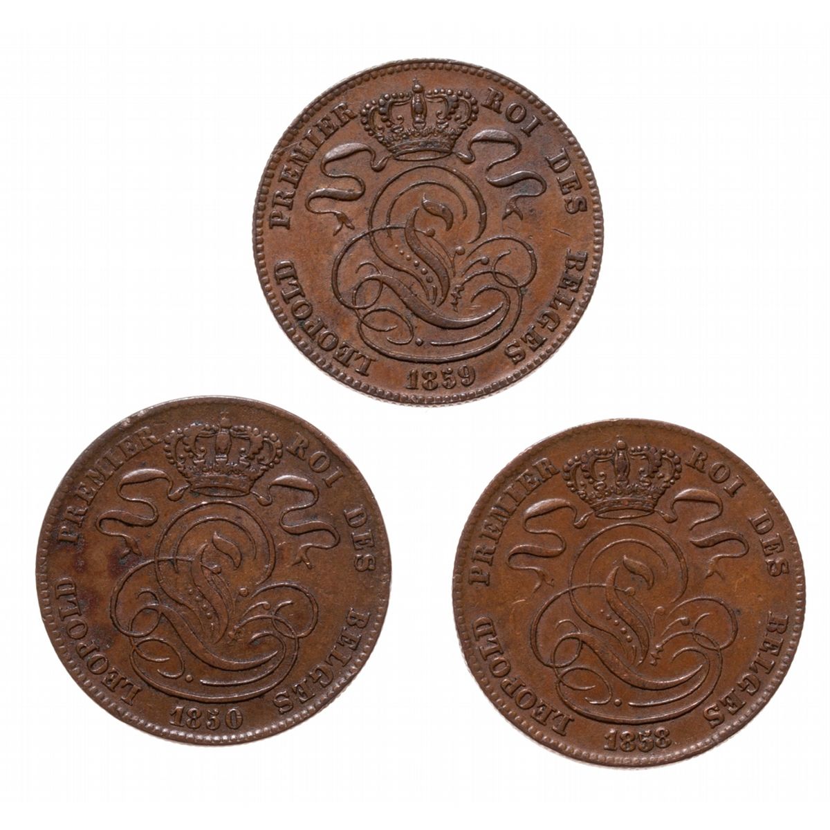 BELGIUM. 5 Centimes. KM#5.2. 1850. VF; 1858. EF; 1859. AU. Lot of three (3) coins.