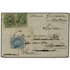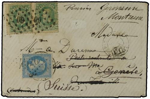 1870 (Sept) Cover from Belgium franked by 1869 10c. green pair tied by ´60´ dotted lozenge, re-mailed to Geneva on arrival in Alsace with France 1867 20c. blue tied by ´4526´ gros chiffres. Montreux eventual arrival cds (Oct 3) on reverse of unusual cover. Scott 32.