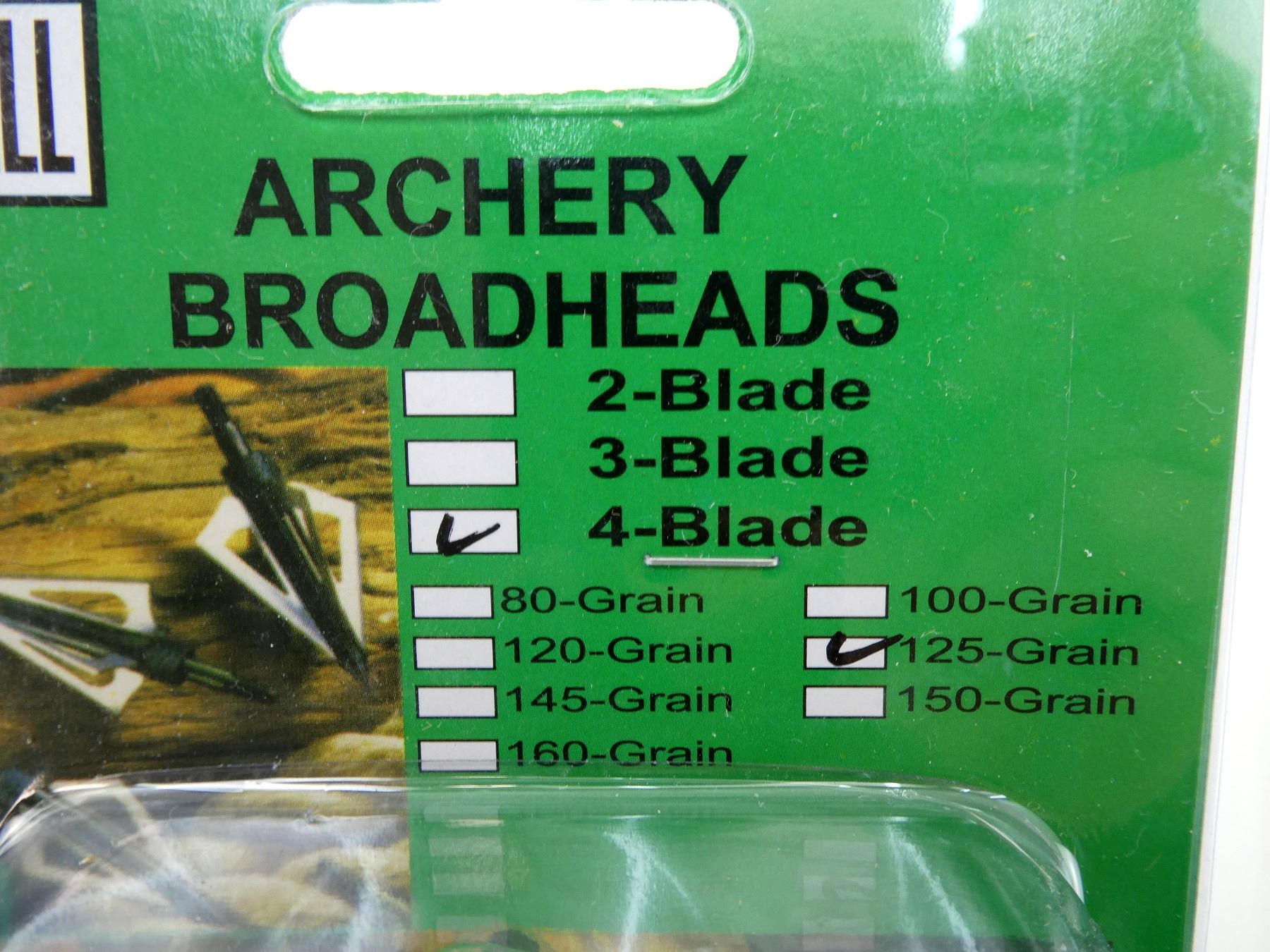 LOT INCLUDES; (6) FIXED BLADE BROADHEADS, (4) BLADE, 125 GRNS (STATED ON PKGS NOT CONFIRMED), 1 3/16' CUTTING DIA, UNOPENED.