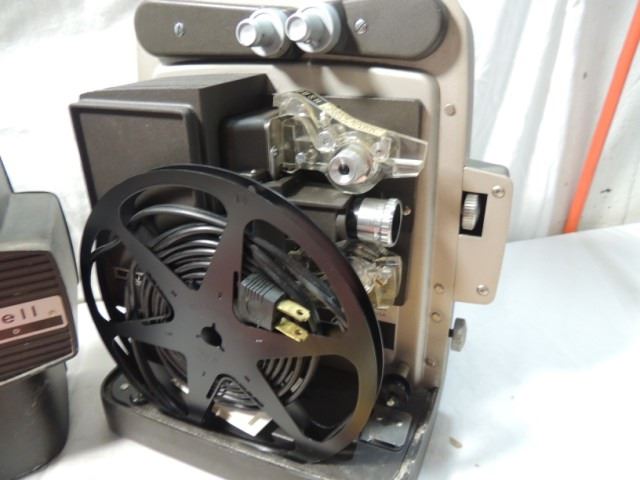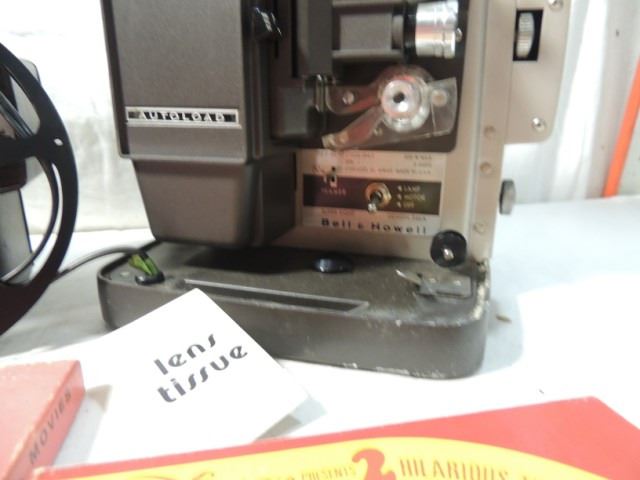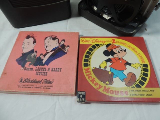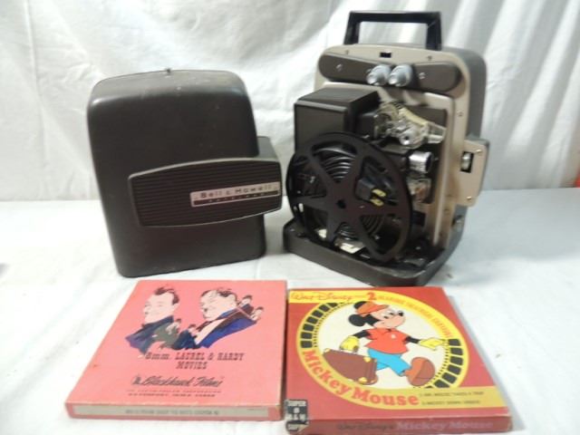NICE WORKING BELL AND HOWELL SUPER 8MM MOVIE PROJECTOR, VINTAGE, INCLUDING TWO MOVIES. LAUREL & HARDY FROM SOUP TO NUTS, AND DISNEY MICKEY MOUSE MR. MOUSE TAKES A TRIP AND MICKEY DOWN UNDER. ALL IN EXCELLENT