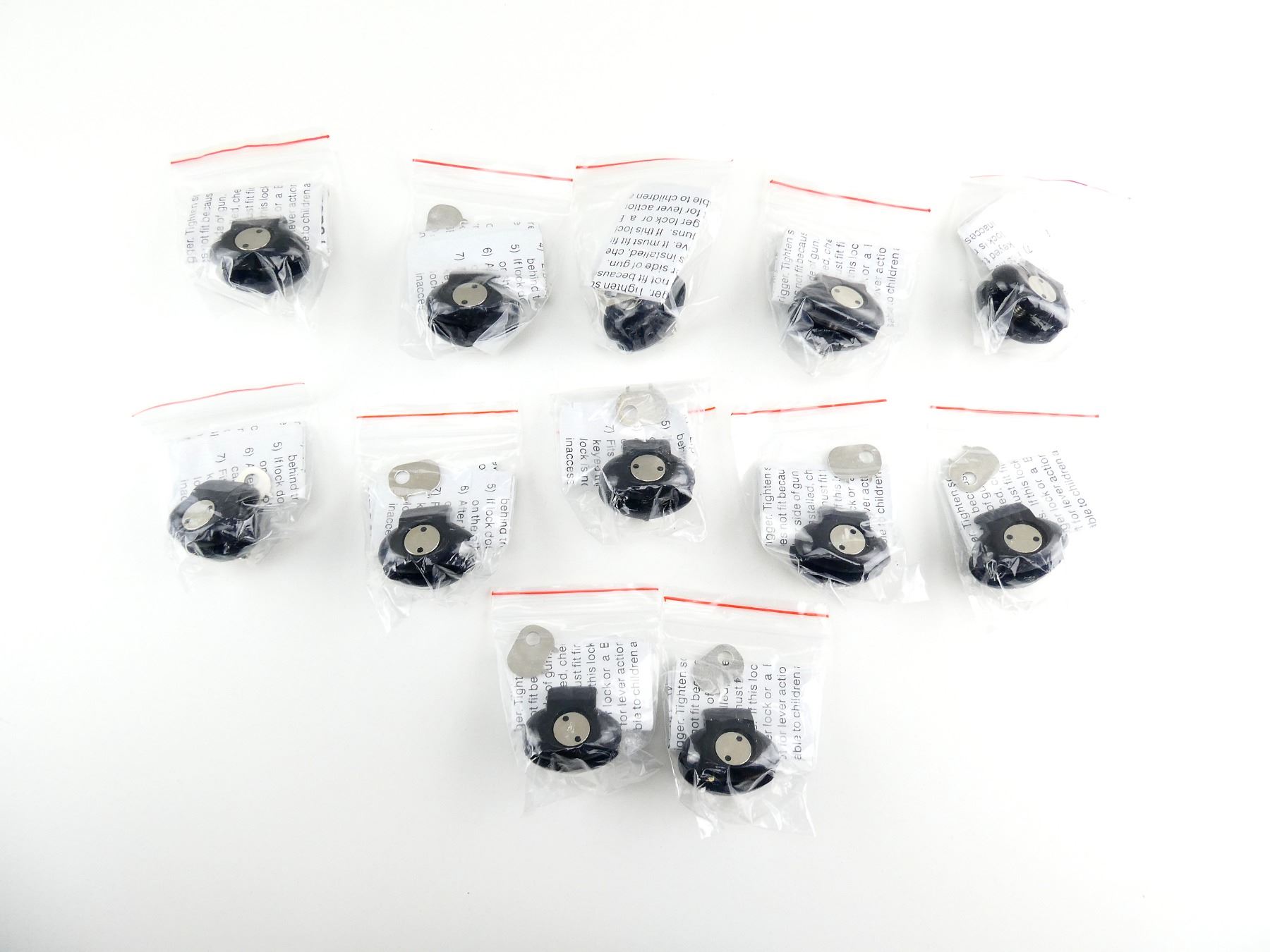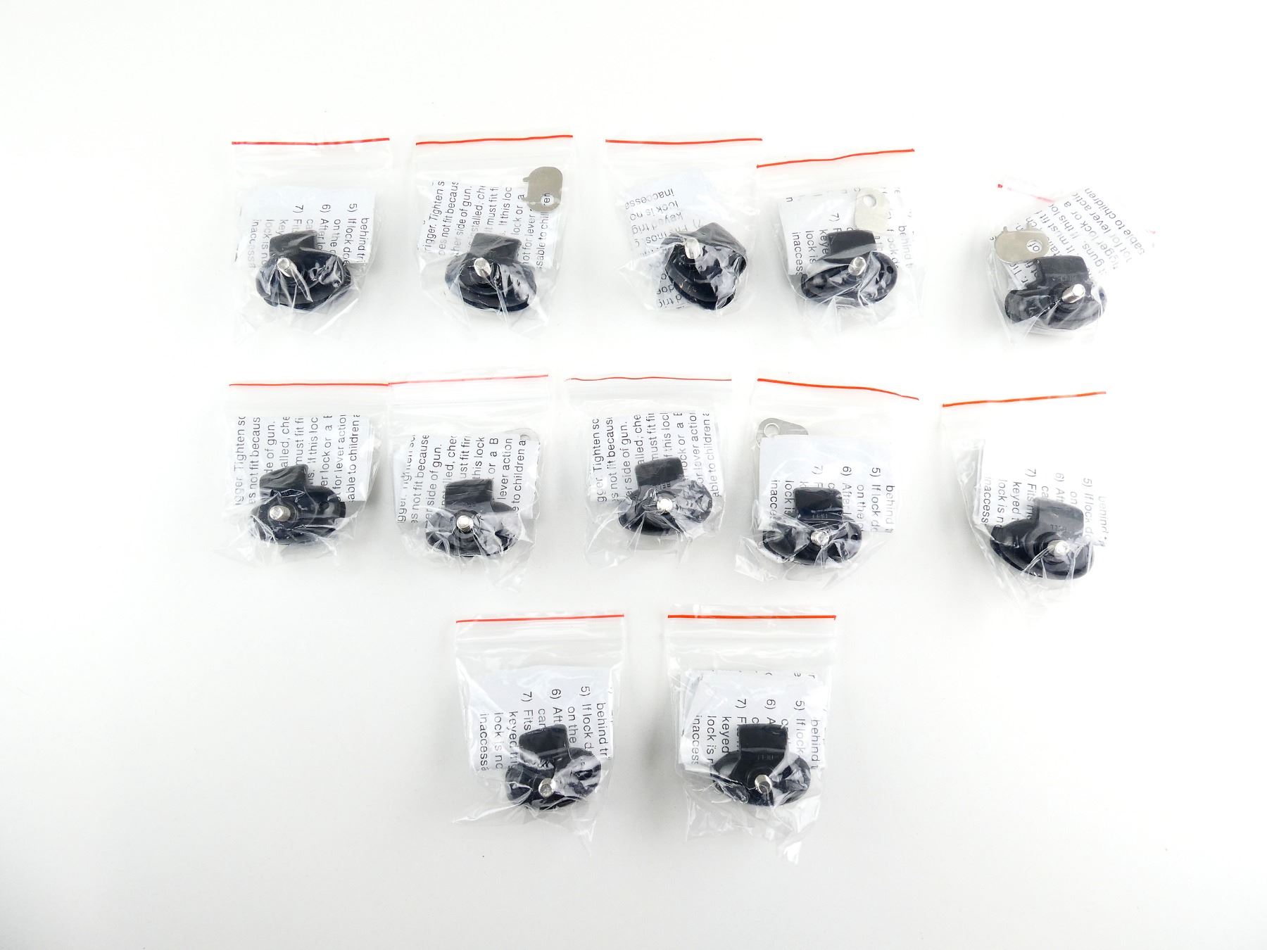 LOT INCLUDES; (12) BLACK POLYMER KEYED TRIGGER LOCKS WITH KEYS, APPEARS NOS IN ORIGINAL PACKAGING. SEE PHOTOS.