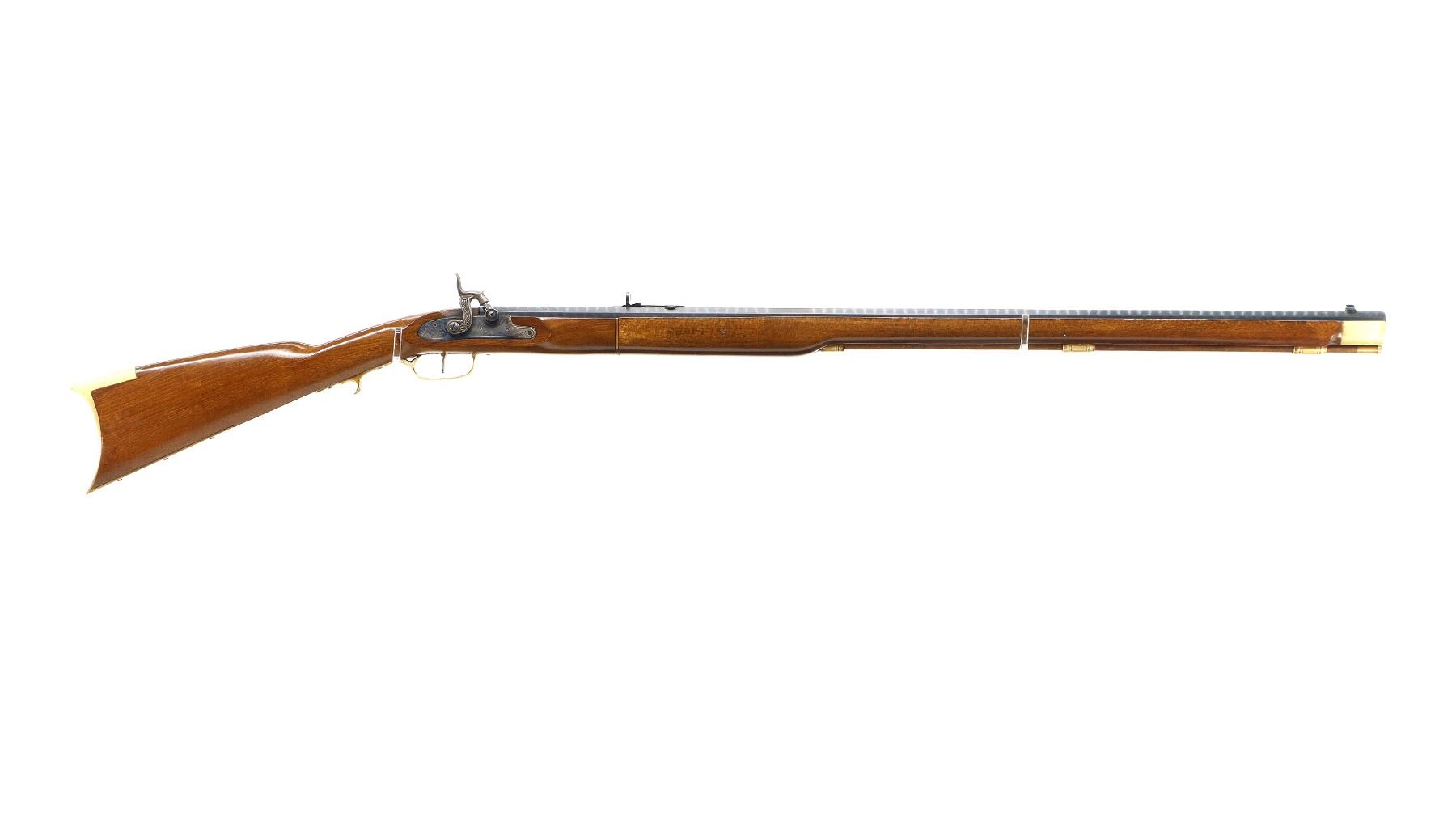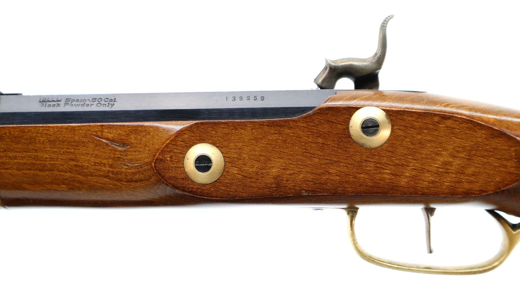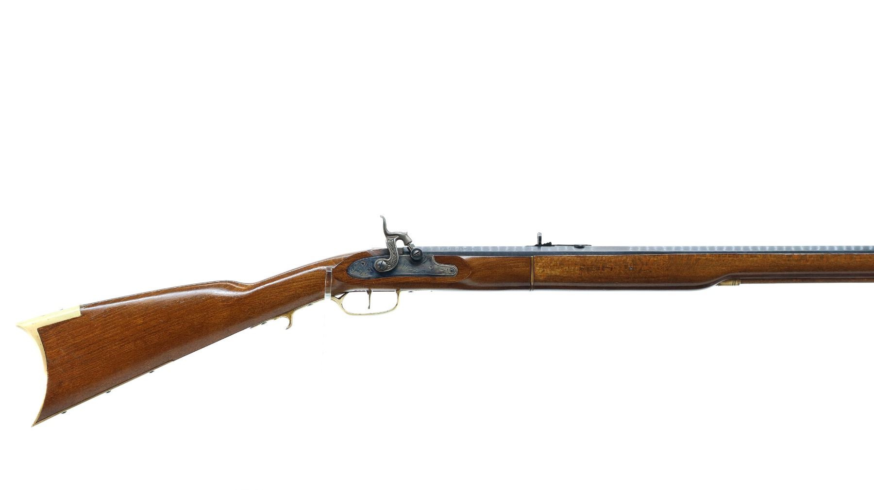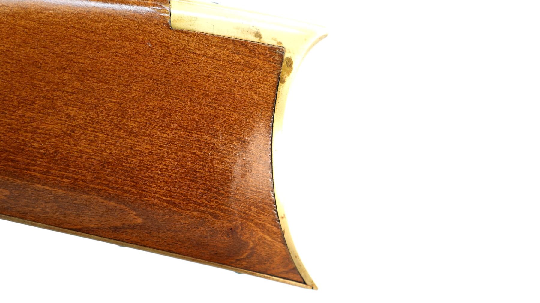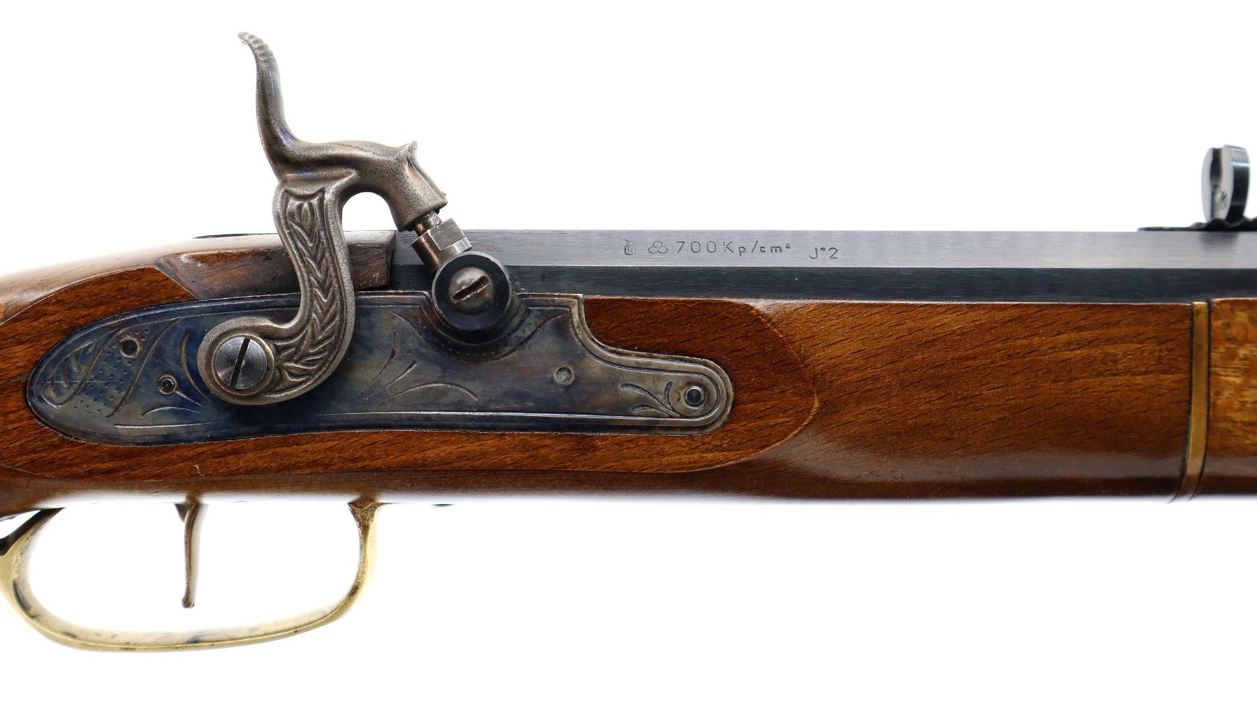 Main Description: Blade front sight, adjustable u notched full buckhorn rear sight, blued octagon barrel, engraved colour case hardened lock and grooved spur hammer that functions. Two piece full length wood stocks, straight grip, smooth curved brass butt plate, finger rest trigger guard and nose cap. Wood ramrod with brass tip