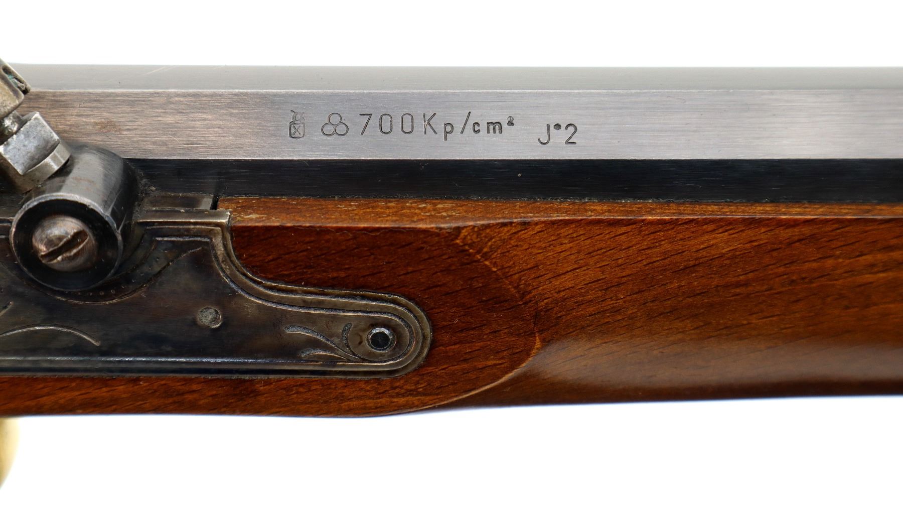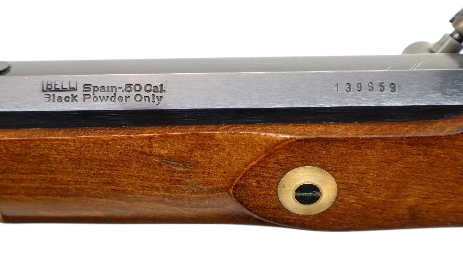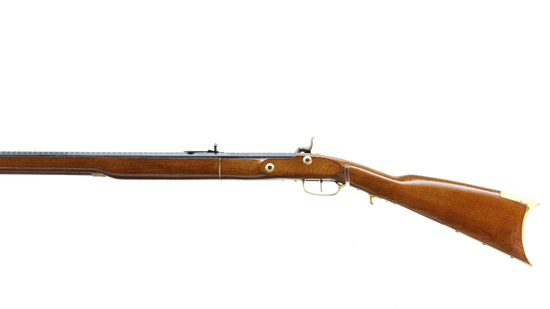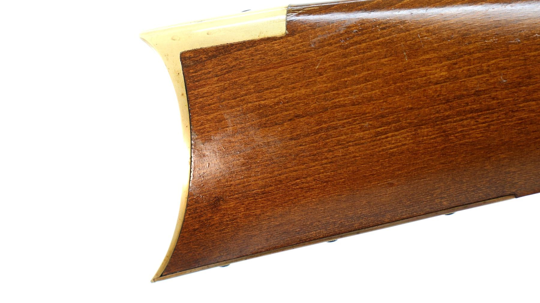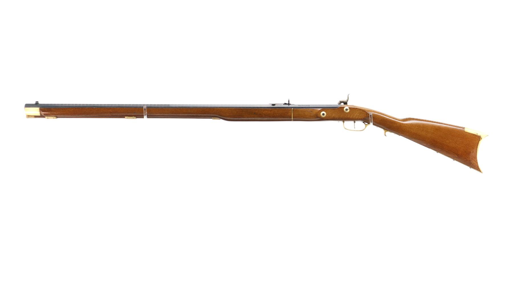 Main Description: Blade front sight, adjustable u notched full buckhorn rear sight, blued octagon barrel, engraved colour case hardened lock and grooved spur hammer that functions. Two piece full length wood stocks, straight grip, smooth curved brass butt plate, finger rest trigger guard and nose cap. Wood ramrod with brass tip