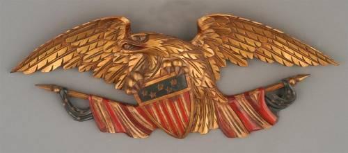 1 BELLAMY STYLE CARVED EAGLE labeled "Richard Orr, Mystic Seaport, Connecticut" 30" wide, circa 1950, ex estimate 400-600