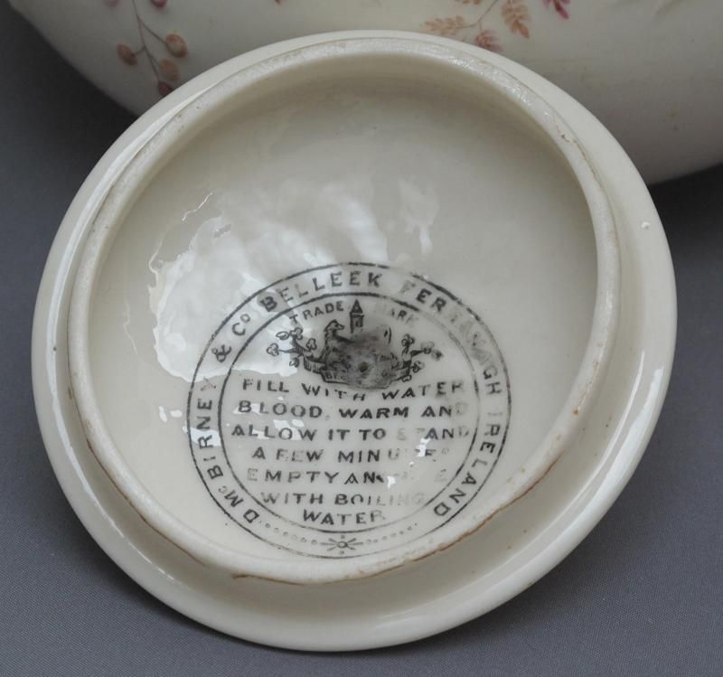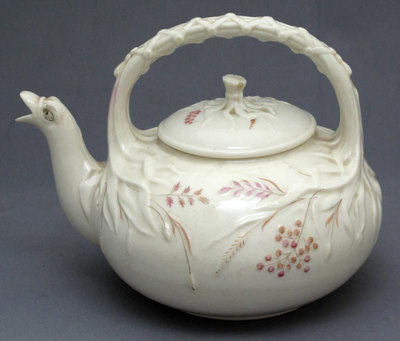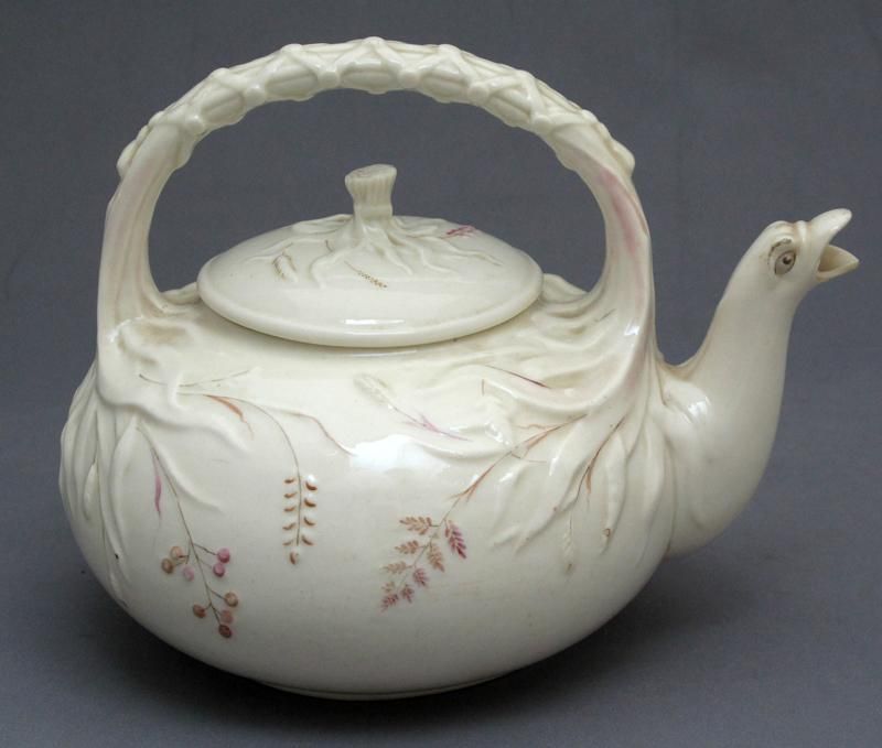 - first period 1863-90, with moulded and painted designs, the spout formed as a bird's head, the cover interior bears the D. McBirney Belleek mark around instructions on how to best treat the porcelain when in use, printed mark in black, (chip to lower tip of spout).