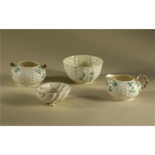 PORCELAIN: Four pieces of Irish Belleek porcelain to include three black mark shamrock basket pieces, sugar (2.25'' x 3.5'')), creamer (2.25'' x 3.5''), and bowl (2.5'' x 4.5''), and a gold mark shell form sugar bowl (2'' x 3.5''), no chips, cracks, or crazing noted.