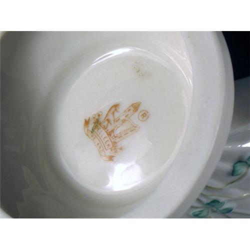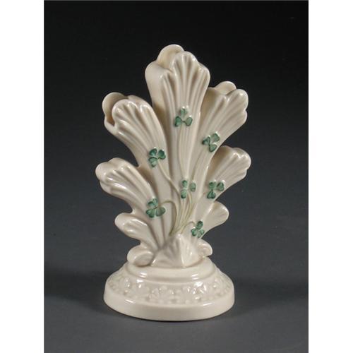 PORCELAIN: Fan-shaped Belleek floral vase having three openings, cream white with green clovers, hallmarked: first gold or seventh mark, 1980, 6.5'' H. Mint condition.