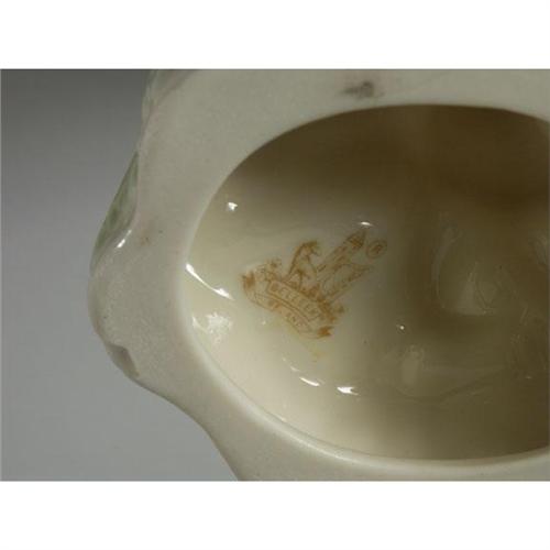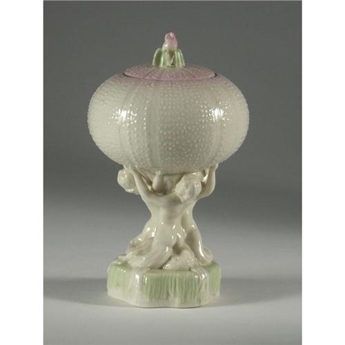 PORCELAIN: Belleek porcelain pedestal dish with lid, mermaids holding a large sea urchin shell, pale green, pink, and gilt detailing, hallmark first gold mark or seventh mark (1980), 9'' x 5'', chip noted to base.
