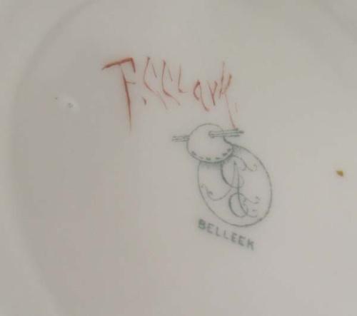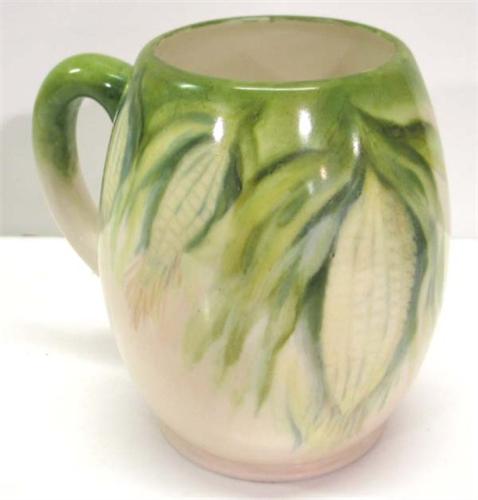 BELLEEK HANDLED MUG. Hand painted corn hush decoration around body. Marked on bottom “Belleek” and signed by artist, Clark. 4.75” H