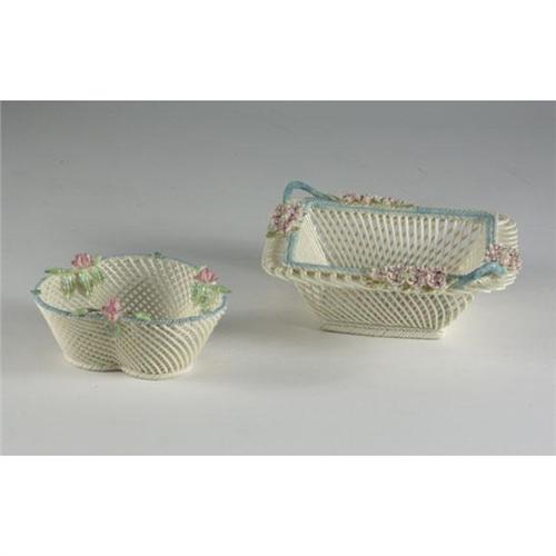 PORCELAIN: Two Beleek Irish porcelain baskets. The first is a polychrome four strand shamrock form basket, applied rose detail, 2'' x 5''. The second is also a polychrome four strand basket with applied floral detail, grated porcelain handles, 2.25'' x 8''. Both have two pad labels on underside to read ''Belleek (R), Co. Fermanagh'' (1955-1979). Flower petal missing to one flower on square basket.