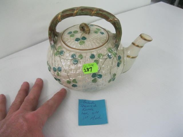 BELLEEK SHAMROCK KETTLE, LARGE, GILT 1ST MARK
