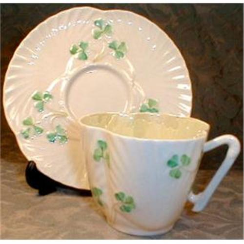 <tr><td>Title:BELLEEK Shamrock CUP Saucer IRISH Harp SHELLS</td></tr>