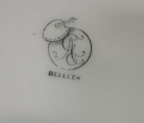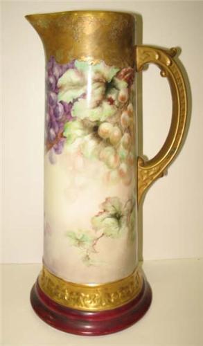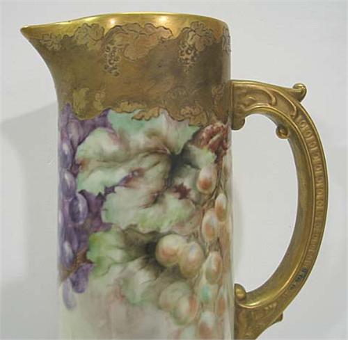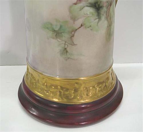 BELLEEK TANKARD PITCHER. Decorated with hand painted grape and vine decoration around body with gilt decorated top, bottom, and handle. Marked on bottom. 14” H
