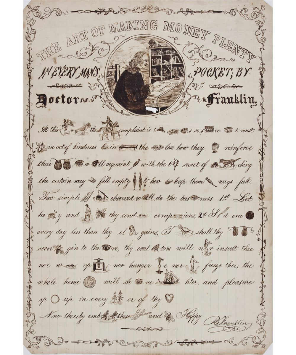 A painstakingly-drawn rebus copied from Benjamin Franklin's "The Art of Making Money Plenty in Every Man's Pocket; by Doctor Franklin", 1p. 9 1/2" x 13 1/2", on very lightly-lined paper, ca. 1840. The rebus, penned in dark brown ink, bears a fairly well-executed portrait of Franklin at top, with various carefully drawn images scattered about the ornate text which concludes with a fairly good copy of Franklin's signature. One ink-eroded hole affects Franklin's desk, else very good.