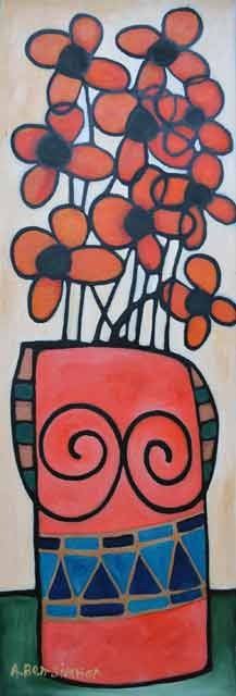 BEN-SIMHON **ORANGE FLOWERS IN RED VASE ** ORIGINAL . Artist: Avi Ben-Simhon - Title: Orange Flowers in Red Vase - Medium: Original Acrylic on Canvas - Signature: This one-of-a-kind work is hand-signed by the artist at the bottom of the image - Image Size: Approximately 39 ½ inches x 13.25 inches - Framed: Unframed on Unstretched Canvas - Details: This work comes with a Certificate of Authenticity - Biography: Avi Ben-Simhon has been deeply inspired by Fauvist and Cubist painters, while creating his signature, unmistakable style. The element of design is strongly developed in his work, in composition and pallet, while the dramatic shapes and vibrant colors powerfully express his joie de vivre. His spiral-like motifs echo his Moroccan roots, each pattern forming an exceptional design in bright and effervescent colors. - Warranty: Item GUARANTEED to be as described