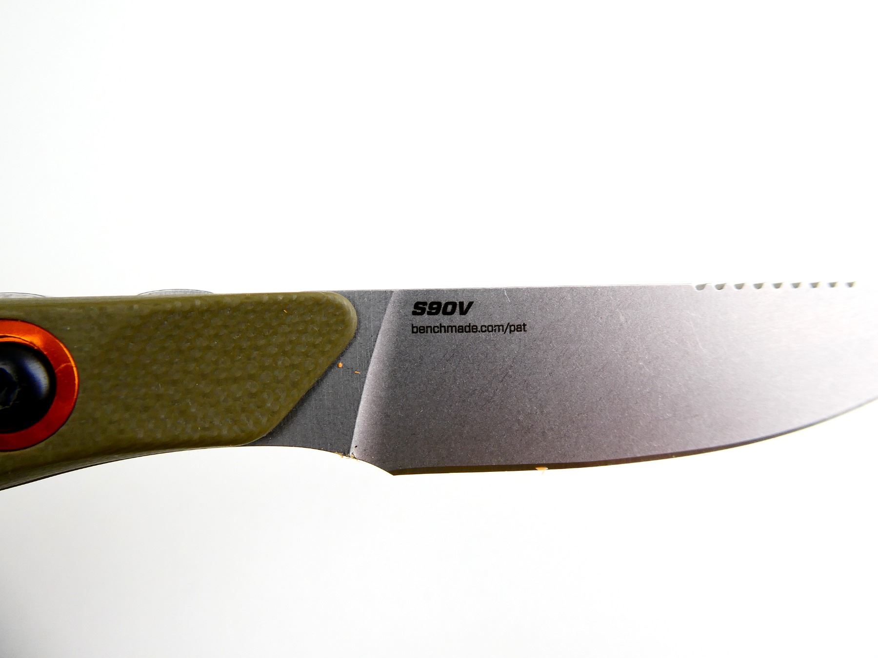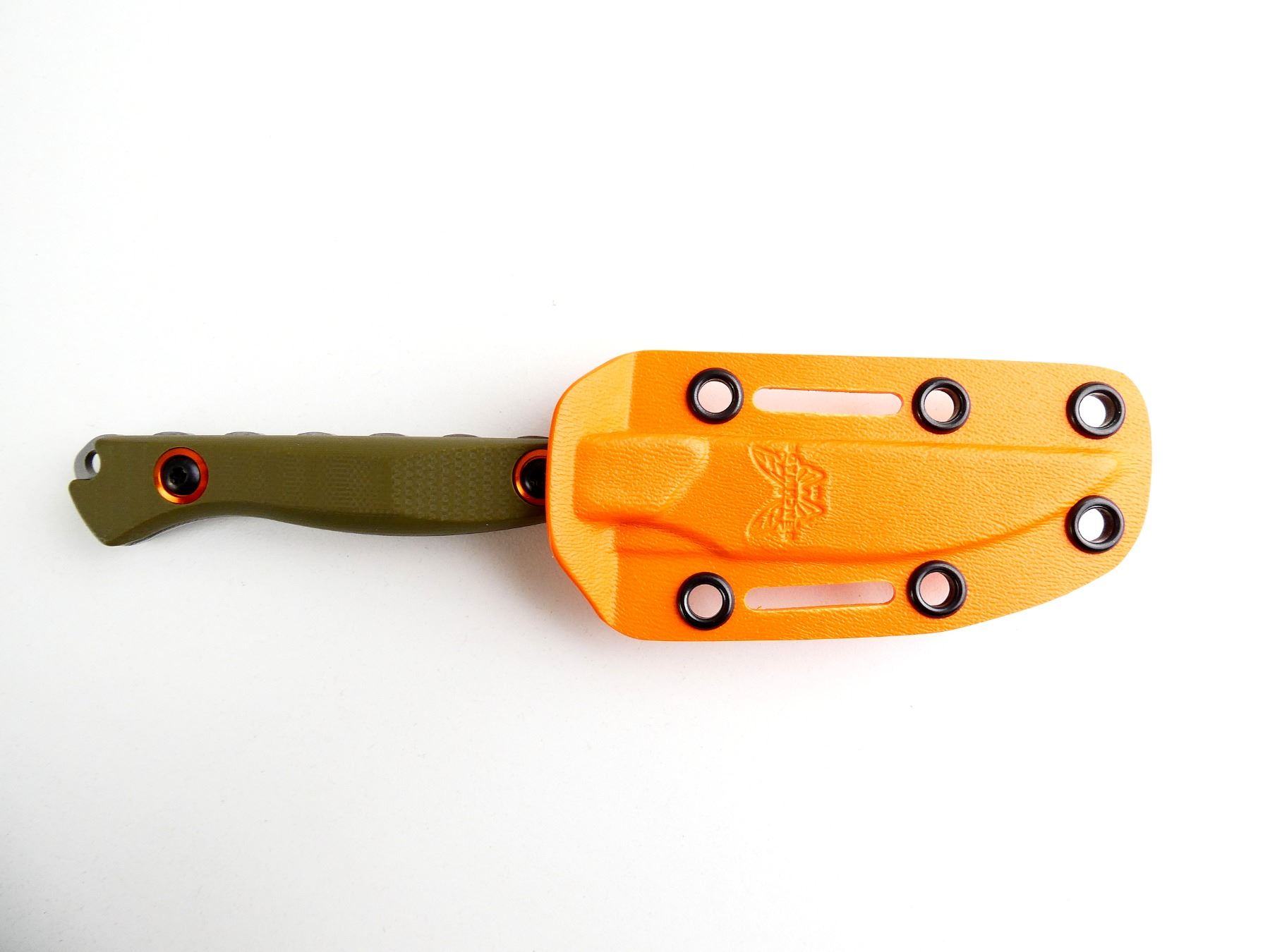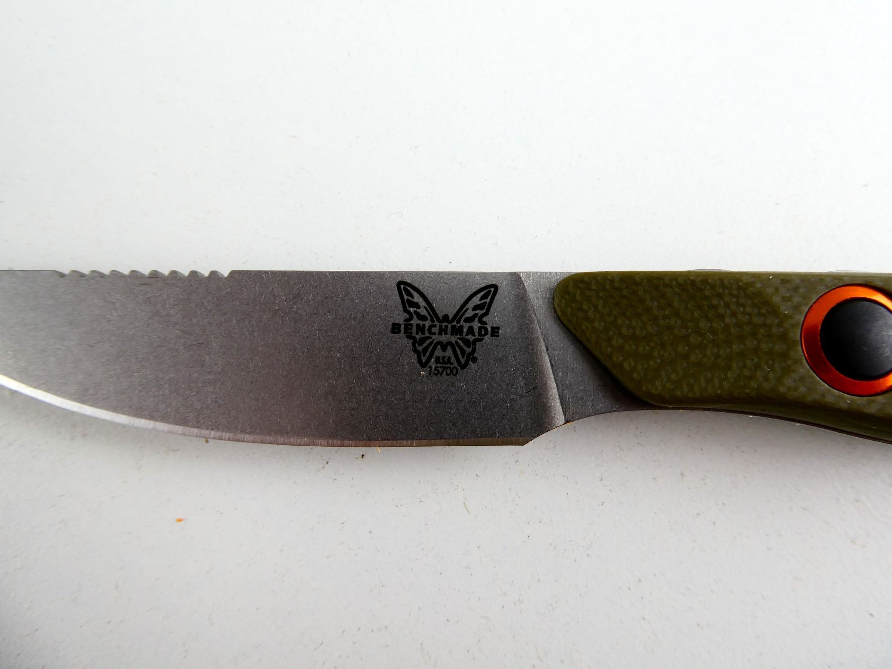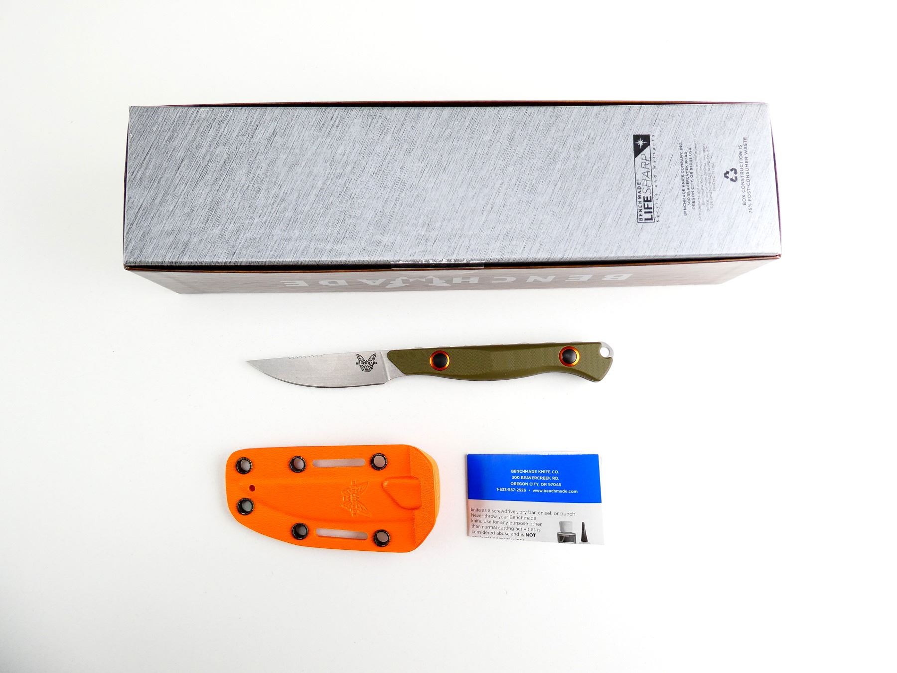 (1) BLUE CLASS, "SELECTEDGE" STEEL FIXED BLADE, GREEN HANDLE, MARKED: "S90V", "BENCHMADE", ETC., ORANGE POLYMER SHEATH, #15700-01, WITH INSTRUCTIONS, APPEARS NOS IN ORIGINAL PACKAGING, BLADE APPROX. 2.75" & OAL APPROX. 7". SEE PHOTOS.