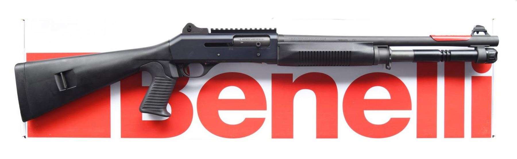 FACTORY BOX. Cal. 12 GA, 2 3/4" or 3". S# Y164786G. Bbl. 18 3/8". M4 semi-automatic shotgun mfg. by Benelli in Italy and imported by Benelli USA Corp. Left side of bbl. is marked with Benelli's mfg. information, with the cal. designation on the right. Left side of receiver exhibits Benelli's importer information, with the model designation and S# on the right. Matte black anodized aluminum receiver with phosphate finished steel bbl. Fixed black polymer buttstock with grooved rubber pistol grip and black polymer forend. Ghost ring rear sight with white dot front sight. UNATTACHED ACCESSORIES: matching factory box. CONDITION: near new, with metal components retaining virtually all of their original factory finishes overall. Mirror bore. Black polymer furniture is excellent overall. Box shows some mild exterior wear and a couple of tears, but otherwise remains sturdy and serviceable. PROVENANCE: the Collection of Gun Sport Ltd owned by Jon R. Thomas. (23-3735/MLW). $1,500-2,250.