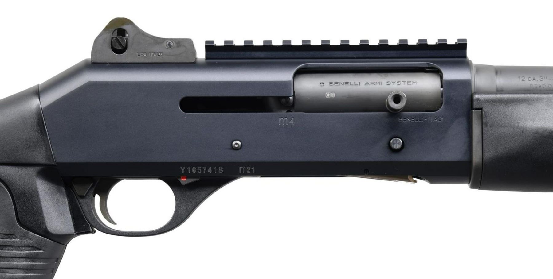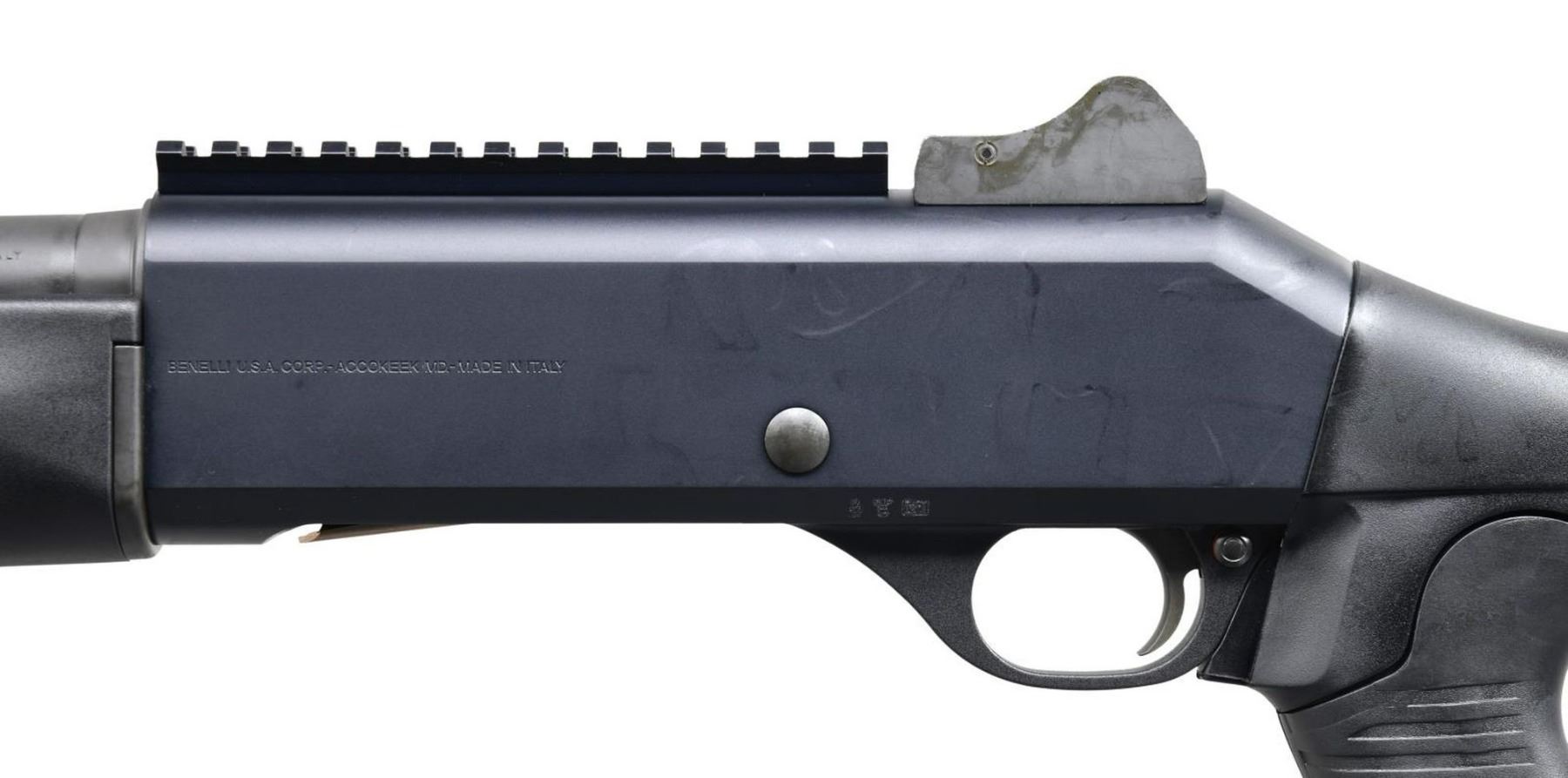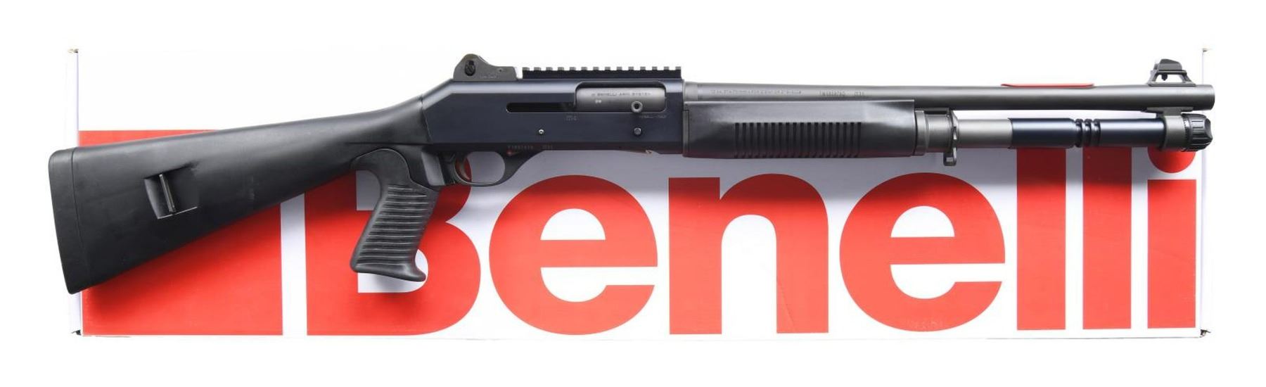 FACTORY BOX. Cal. 12 GA, 2 3/4" or 3". S# Y165741S. Bbl. 18 3/8". M4 semi-automatic shotgun mfg. by Benelli in Italy and imported by Benelli USA Corp. Left side of bbl. is marked with Benelli's mfg. information, with the cal. designation on the right. Left side of receiver exhibits Benelli's importer information, with the model designation and S# on the right. Matte black anodized aluminum receiver with phosphate finished steel bbl. Fixed black polymer buttstock with grooved rubber pistol grip and black polymer forend. Ghost ring rear sight with white dot front sight. UNATTACHED ACCESSORIES: matching factory box. CONDITION: near new, with metal components retaining virtually all of their original factory finishes overall. Mirror bore. Black polymer furniture is excellent overall. Box shows some mild exterior wear and a couple of tears, but otherwise remains sturdy and serviceable. PROVENANCE: the Collection of Gun Sport Ltd owned by Jon R. Thomas. (23-3760/MLW). $1,500-2,250.