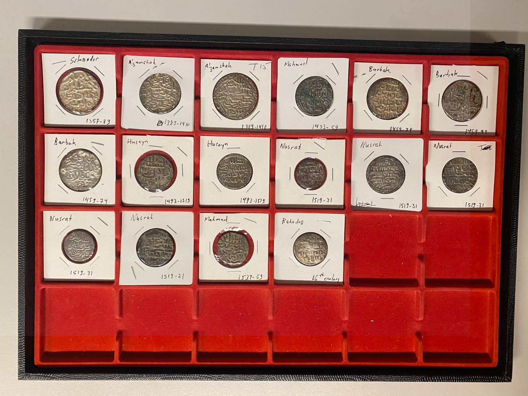 BENGAL: LOT of 16 silver tankas, including Sikandar, 1357-1389 (1 pc), A'zamshah, 1389-1410 (2), Mahmud, 1433-1459 (1), Barbak, 1459-1474 (3), Husain, 1493-1519 (2), Nusrat, 1519-1531 (5), Mahmud, 1532-1538 (1), and one tanka of Chittagong in the name of Bahadur and dated AH959; nearly all are VF, with many better, most struck before 1493 with the usual banker's marks; nearly all without mint name and only a few with legible date; retail value $700, lot of 16 pieces.
