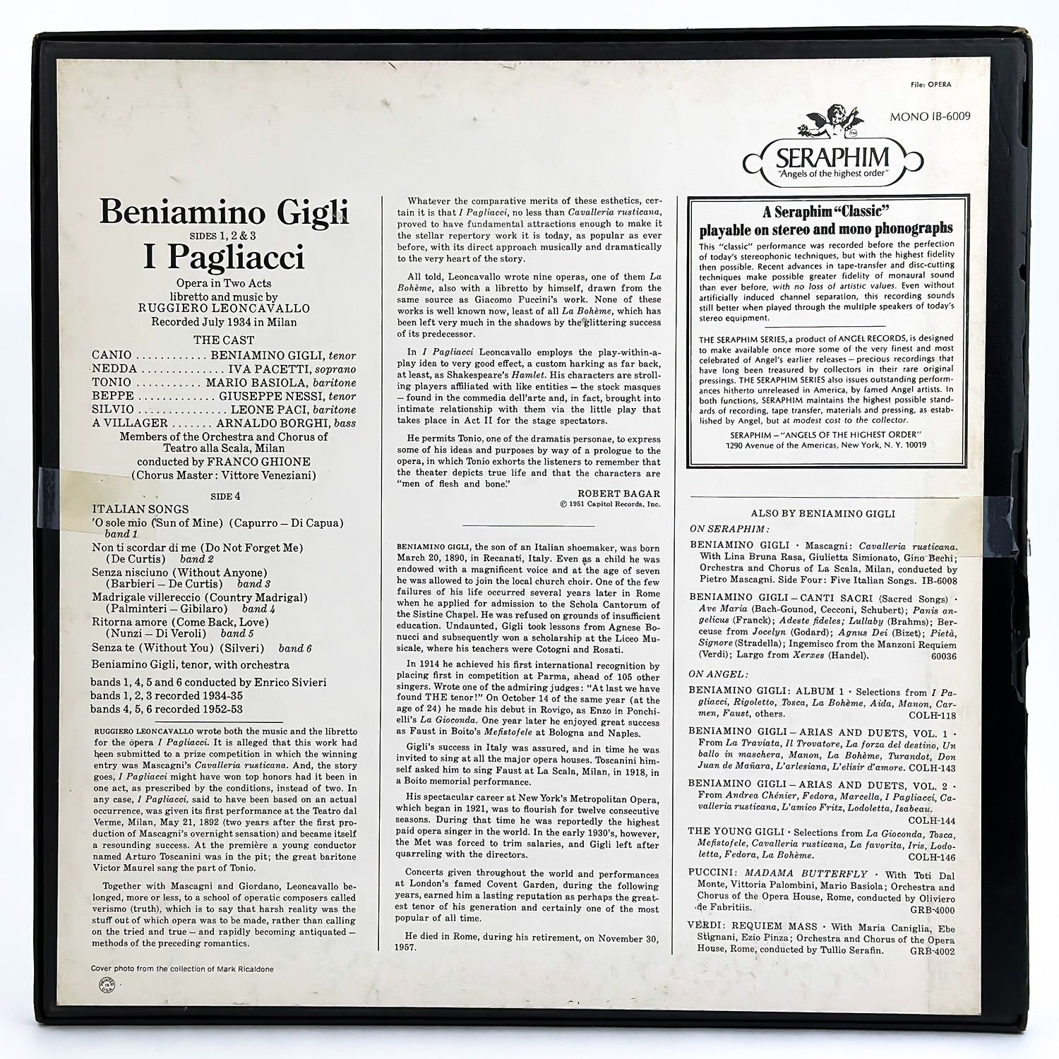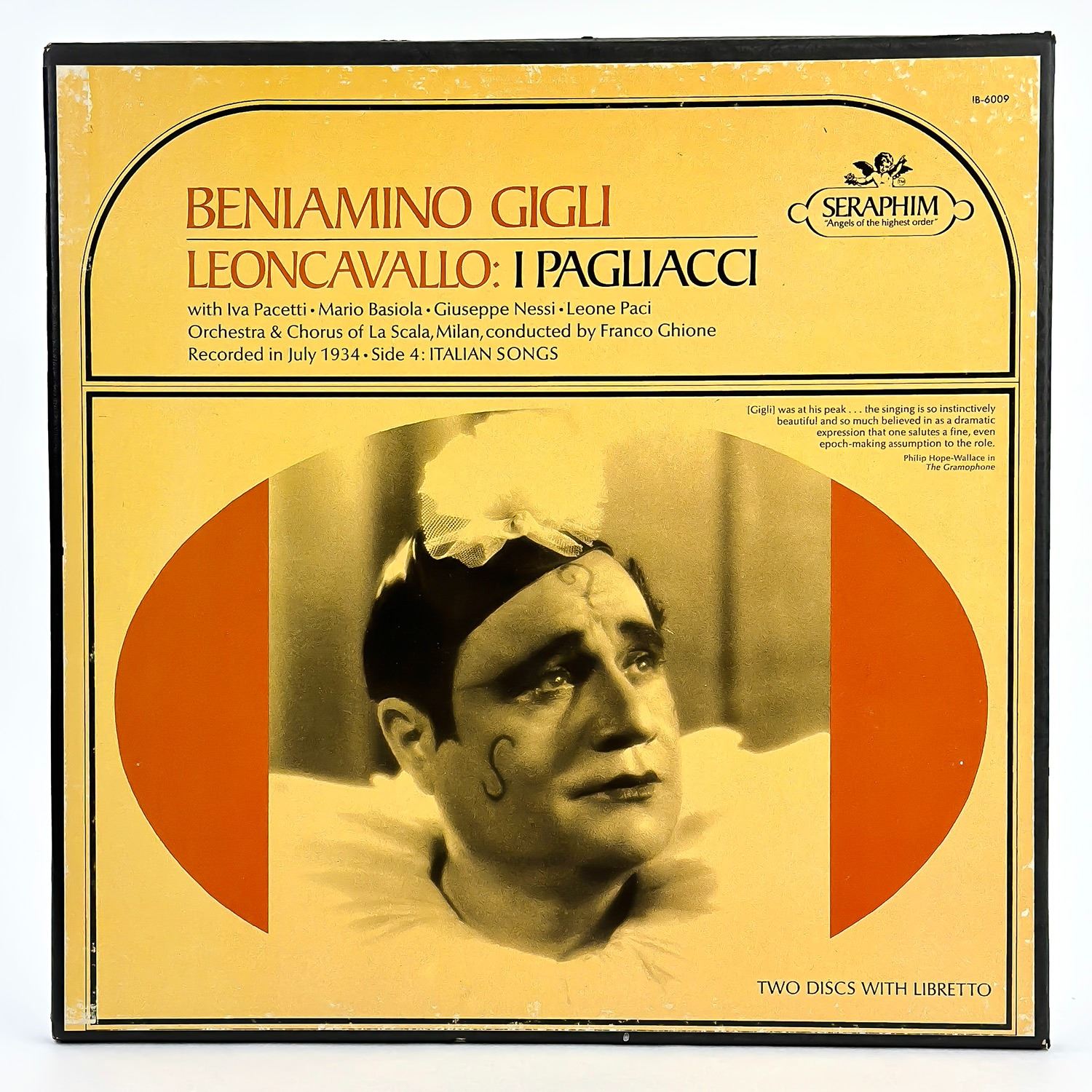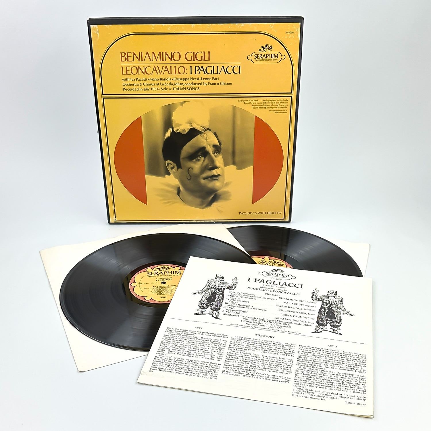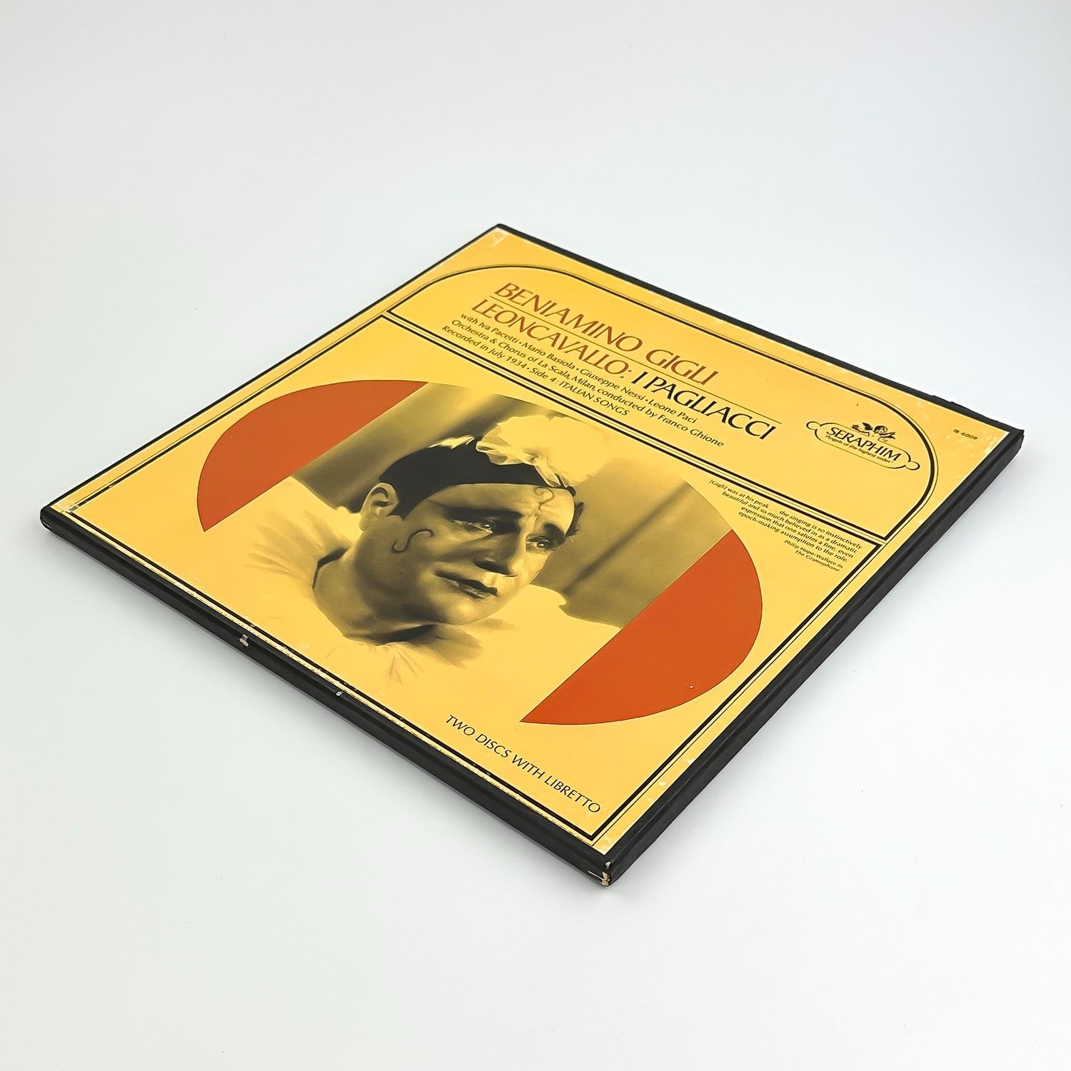#9592 - 2X VINYL LP RECORD ALBUM BOXED SET & INFORMATIONAL TRI-FOLD SHEET. CLASSICAL, OPERA - I PAGLIACCI WITH IVA PACETTI, MARIO BASIOLA, GIUSEPPE NESSI, LEONE PACI, ORCHESTRA & CHORUS OF LA SCALA, MILAN, CONDUCTED BY FRANCO GHIONE, RECORDED IN JULY 1934 - SIDE 4 ITALIAN SONGS. SERAPHIM RECORDS IB-6009. RECORD ALBUM FROM PRIVATE COLLECTION OF CLASSICAL/OPERA RECORDS.