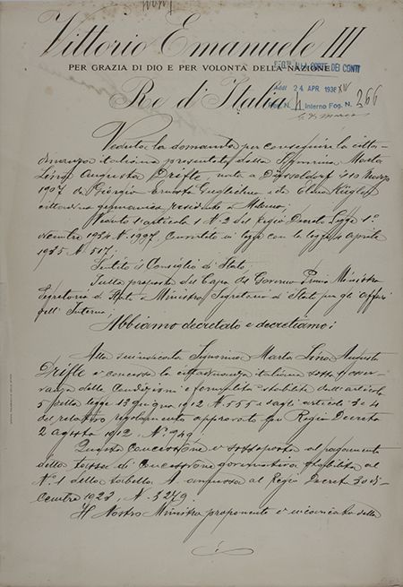 (1883 - 1945) Italian dictator whose fascist supporters marched on Rome, securing him power; allied with Hitler, after many military and political setbacks he was captured and executed at war's end by partisans. Manuscript D.S. "Mussolini", 2pp. legal folio, Rome, Apr. 6, 1936, in Italian. Untranslated but appears to deal with a personnel issue. Also boldly signed by King VICTOR EMANUELE III (1869 - 1947) King of Italy who essentially served as a figurehead during Mussolini's administration, abdicated the throne following the end of World War II. Some foxing at top margin, minor show-through, still very good.