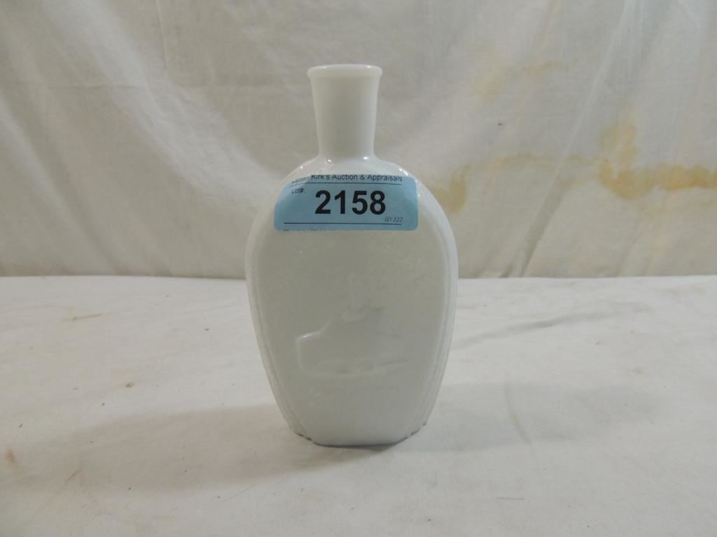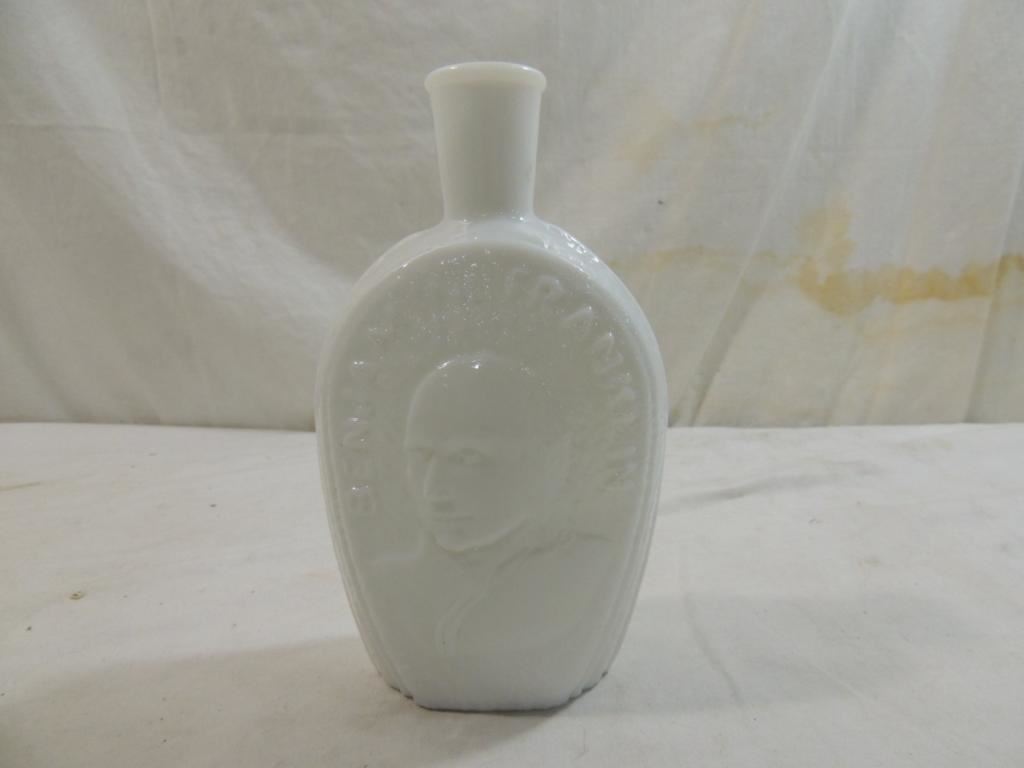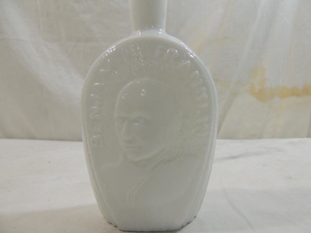 BENJAMIN FRANKLIN MILK GLASS BOTTLE, DECORATIVE BOTTLE, GLASS HOUSE, AS SHOWN SEE PHOTO FOR MORE DETAILS