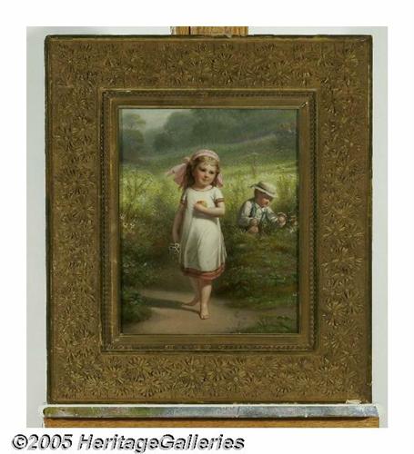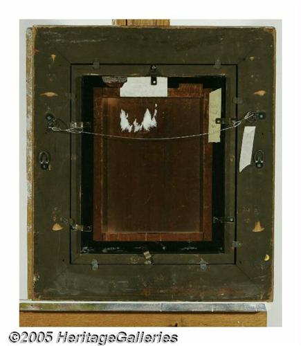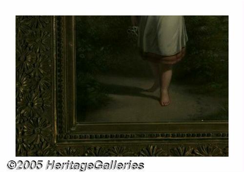 <B>BENJAMIN FRANKLIN REINHART (American 1844- 1896)</B></I><BR>Among the Daisies, 1873<BR>Oil on canvas laid down on panel<BR>15in. x 12.25in.<BR>Signed and dated lower left<BR>Inscribed on reverse 'Among the Daisies/ Painted by B. Franklin Reinhardt, N. York, Dec. 18, 1872'<BR><BR>Condition Report: Canvas was wax-lined and restretched over original panel, canvas is bubbled in center and concave near edges, paint is wrinkled in corners, several very small tears in upper right area finely inpainted, scattered specks of fine inpainting in figure of girl, vertical scratch running through boy inpainted with other areas in figure also.<BR><BR>Brian Roughton: No problem with authenticity. Condition as noted.<BR>