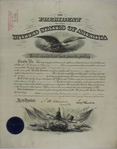 (1833 - 1901) 23rd President of the United States. Partly-printed D.S. "Benj Harrison" , 1p. folio parchment, Washington, Jan. 7, 1892, the appointment of WILLIAM M. WHERRY as Major of Infantry, co-signed by Secretary of War JOHN B. ELKINS. Folds, else fine condition. William M. Wherry (1836-1918) was awarded the Medal of Honor for his actions at the Battle of Wilson's Creek on Aug. 10, 1861, where he "displayed conspicuous coolness and heroism in rallying troops that were recoiling under heavy fire" while serving as a First Lieutenant of Co. D, 3rd Reserve Missouri Infantry.