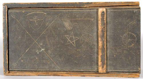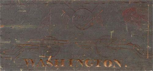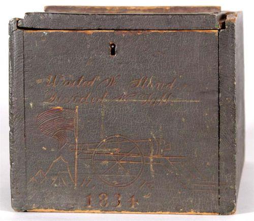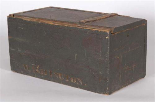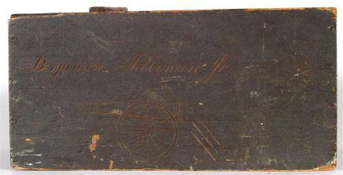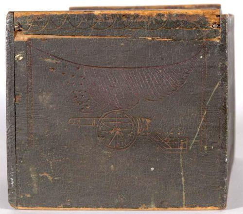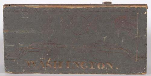 BENJAMIN ROBINSON, JR., PATRIOTIC MILITARY PAINTED AND DECORATED SLIDE BOX 18"x9"x10", incised with 7 canons, 8 flags (some with polychrome), tents and a Naval shield as well as a deeply carved "WASHINGTON, the date 1776" in a flag, his name and the phrase, "United We Stand, Divided We Fall" and the date "1834", CONDITION: paint and decoration excellent, old splinter breaks to slide, PACKING AND SHIPPING BY FAIRFIELD AUCTION WITHIN CONTINENTAL USA (excluding insurance) $40,