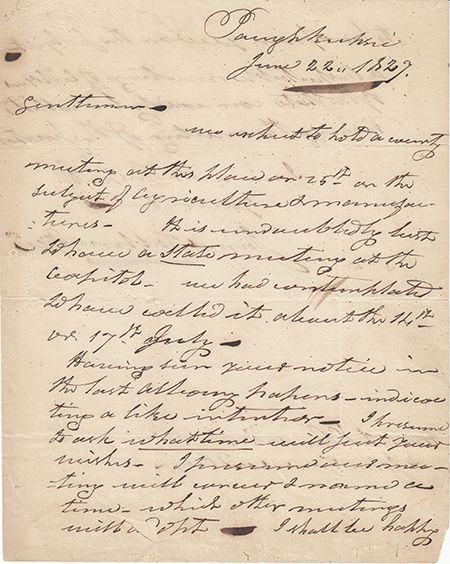 (1754 - 1835) Soldier and politician best remembered today as Washington's chief intelligence officer who ran the Culper spy ring out of New York City and Long Island. A.L.S. 2pp. 4to. with integral address leaf, Poughkeepsie, June 22, 1827 to Stephen Van Rennsalear and John Townshend in Albany concerning a meeting "On the subject of Agriculture & manufactures…" Partial separations at horizontal folds, light soling and a few marginal losses, else very good.