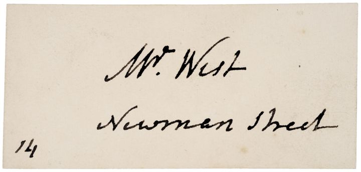 Superb quality Visiting Card Signed, “Mr. West - 14 Newman Street,” no date or place, 1.5” x 3,” Choice Crisp Near Mint. It is written upon an attractive, clean crisp card stock that has a trace of prior mounting on its blank reverse. The bold brown signature and text is superb.