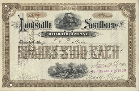 (?-1919) Confederate officer who served in the Kentucky, but is best remembered for his daring raid on St. Albans, Vermont. Upon confinement he escaped from prison. Partly-printed D.S., 1p. oblong 4to., June 13, 1893, a certificate issuing 4 3/4" shares in the Louisville Sothern Railroad Company, signed by Young as president. Ink stamp barely affects two letters in signature, else very good.