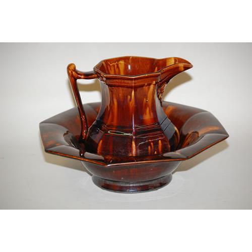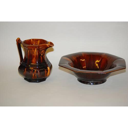 BENNINGTON TYPE POTTERY PITCHER & BOWL SET-19TH CENT. 8-PANEL PITCHER & BOWL SET-UNMARKED, PITCHER W/ EMBOSSED DECORATION (PITCHER-8.25" T, BOWL-13.5" DIA.) -MINOR CHIPS TO PITCHER RIM, BASE RIM CHIPS ON BOWL, CRAZING & SMALL LINES, IMPERFECTIONS