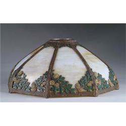 Lot 864 BENT PANEL SHADE Very nice lamp shade only has eight carmel slag bent panels with a metal overlay design of leaves and flowers decorating the bottom of each panel. Leaves and flowers are enameled in green, yellow and orange while remainder of frame is colored in brown. SIZE: 17-1/2” across. CONDITION: All panels are very good, paint on frame shows some wear. 5-70735