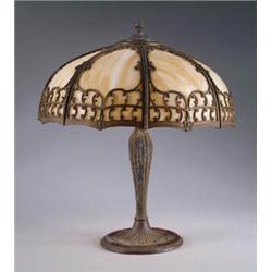 Lot 836 BENT PANEL TABLE LAMP Nice eight panel shade has carmel slag bent panels inside an ornate openwork metal frame. Shade sets atop a metal base with vertically ribbed stem and double sockets. SIZE: Shade is 18” dia. Overall height is 21”. CONDITION: Some wear to finish on base and frame, otherwise very good. Shade and base probably did not start life together. 5-70347