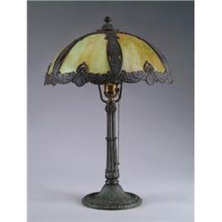 Lot 863 BENT PANEL TABLE LAMP Ornate bent panel table lamp with metal overlay. Unsigned. SIZE: 20” t x 14” w. CONDITION: Chip to panels. Solder work to frame and discoloration to interior of frame. Socket replaced on base. 5-70348